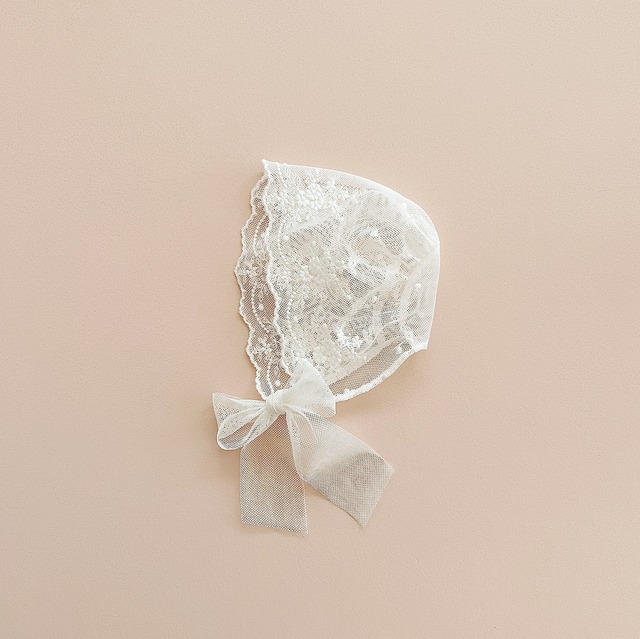 ベビーボンネ / コットンチュール・フラワー刺繍 / 新生児~6か月 お宮参り 出産記念 帽子