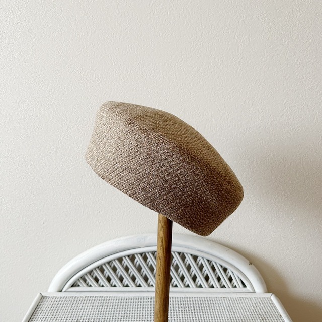 イングランドMARLING&EVANS社のツイードを使用したベレー帽 ベージュトーンの様々な素材が織り込まれ、あたたかみと上質な風合いのあるツイードです。 トップの直径が小さめのコンパクトな形でやわらかめに仕上げていますので、主張は控え目にクラシカルなスタイルにしてくれます。 背が低い方にもバランスが取りやすいデザインです。 左側面にゴールドメタルボールのアクセント。 イヤリングやピアスとのコーディネートもおすすめです。 ウールがブレンドされていますがドライな風合いで、季節を問わずコーディネートをお楽しみいただけます。 MARLING&EVANS社 1782年に創業した生地紡績・染織メーカー。自然素材を使用した伝統的なスタイルを大事にしておりハイブランドにも生地を提供しています。 ------------------------------------------------------ 〇素材 表地:コットン35%、シルク35%、ウール15%、リネン15% イングランド製 裏地:コットン60%、キュプラ40% 日本製 〇カラー 表地:モカベージュ 裏地:ブラック 〇サイズ M 頭囲58cm、トップ直径約22cm、高さ約7.5cm ※内側にサイズ調節用のリボンを通していますので、上記頭囲を最大として数センチ小さく調整が可能です。 ※一般的な頭囲ではなく、帽子をかぶる位置での計測をおすすめいたします。 ◯発送までの日数 ご購入後、3営業日(平日)以内に発送いたします。 別サイズでもお作りいたします。(レーディースサイズ、キッズサイズ) 生地の在庫状況をお調べしますのでお気軽にお問合せください。
