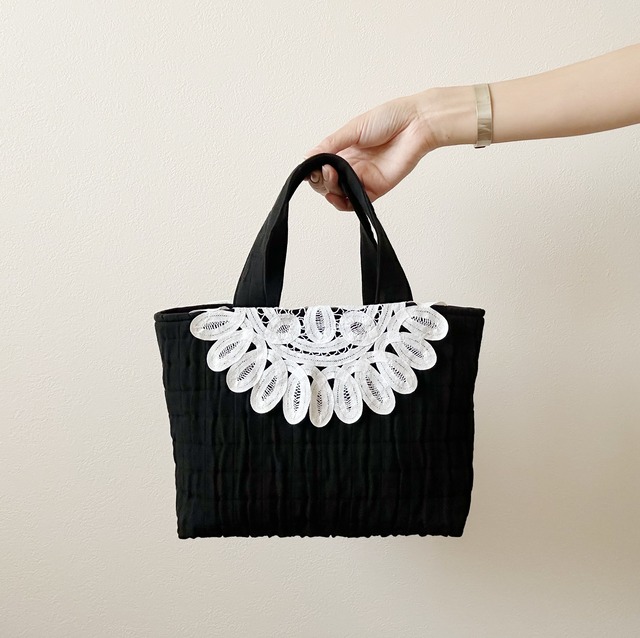 フランスヴィンテージレースのリメイクトートバッグ 見ているだけで明るい気分になるお花のようなモチーフのバテンレース。 どの角度からもレースが見え、外出をよりいっそう楽しい時間にしてくれそうです。 表側の黒い生地はフランスの老舗生地メーカーDUTEL社のキルティング生地。 モダンな雰囲気で上質感があり、シンプルなお洋服のポイント使いにも。 裏地は持ち物を探しやすいようモカベージュのコットンを合わせました。 長財布やスマートフォン、小さめのコスメポーチなども入るコンパクトなサイズ。 自立しますので中のものも取り出しやすくなっています。 ポケットは内側に1か所、入れ口にマグネット付き。 ※画像7枚目はコーディネート例 -------------------------------------------------- ◯素材 表地:本体ベースのキルティング/ フランス製 / コットン54%、ポリエステル46% 裏地:コットン100% 日本製 バテンレース/ フランスヴィンテージ おそらくコットンと思われます ◯カラー 表地:本体/ ブラック バテンレース/ ホワイト 裏地:上部/ ブラック 下部/ モカベージュ ◯サイズ 画像8枚目をご参照ください。 ◯コンディション レースはほつれやシミもなく非常に良いコンディションです。 ◯発送までの日数 ご購入後、3営業日(平日)以内に発送いたします。 バッグをたたんでお送りします。 レースは一度使用されたもののアップサイクルになります。 その点ご理解いただける方のご購入をお願いいたします。