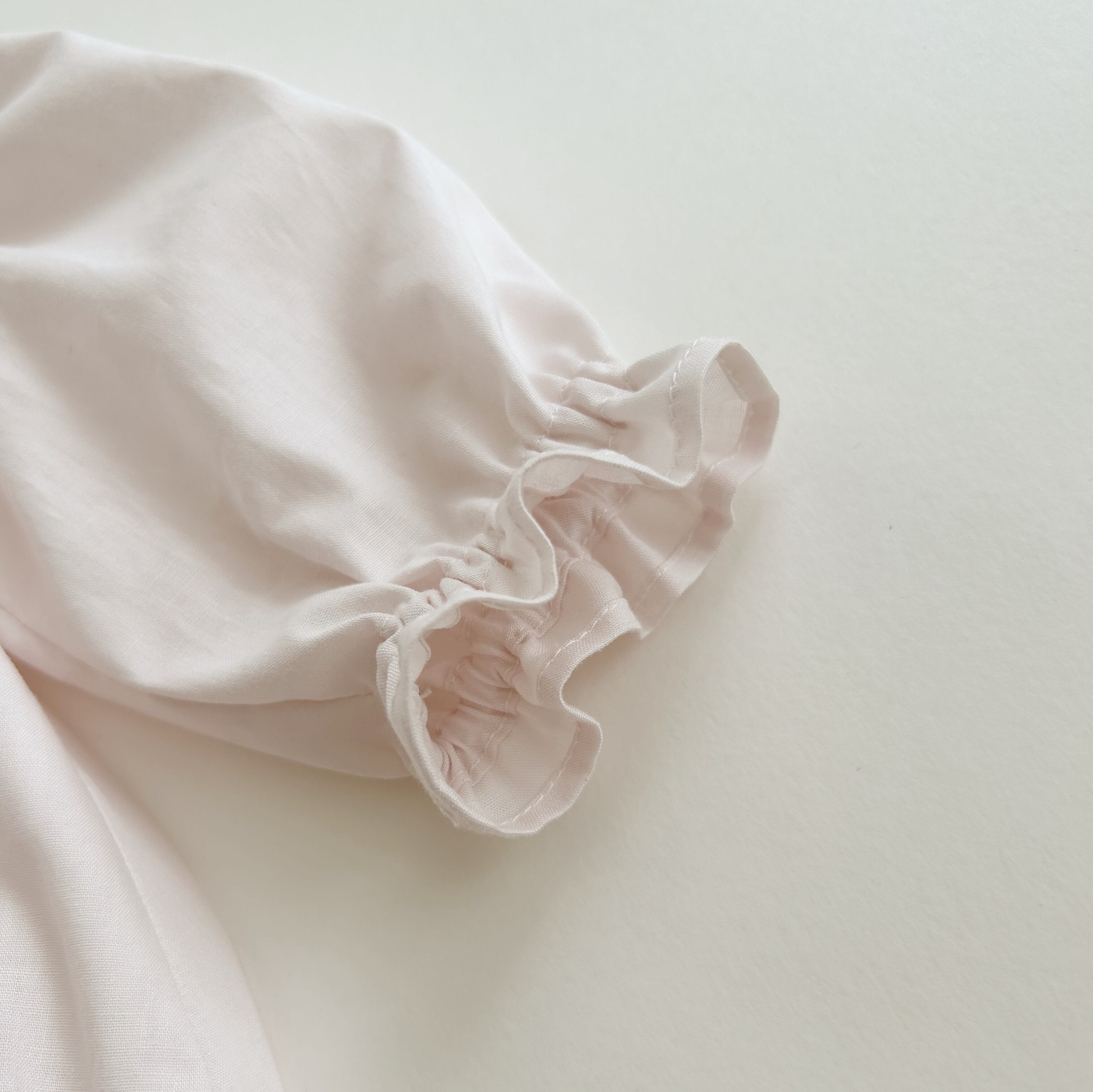シンプルなボディに小花のレースやフリル袖、後ろにはハートのシェルボタン。