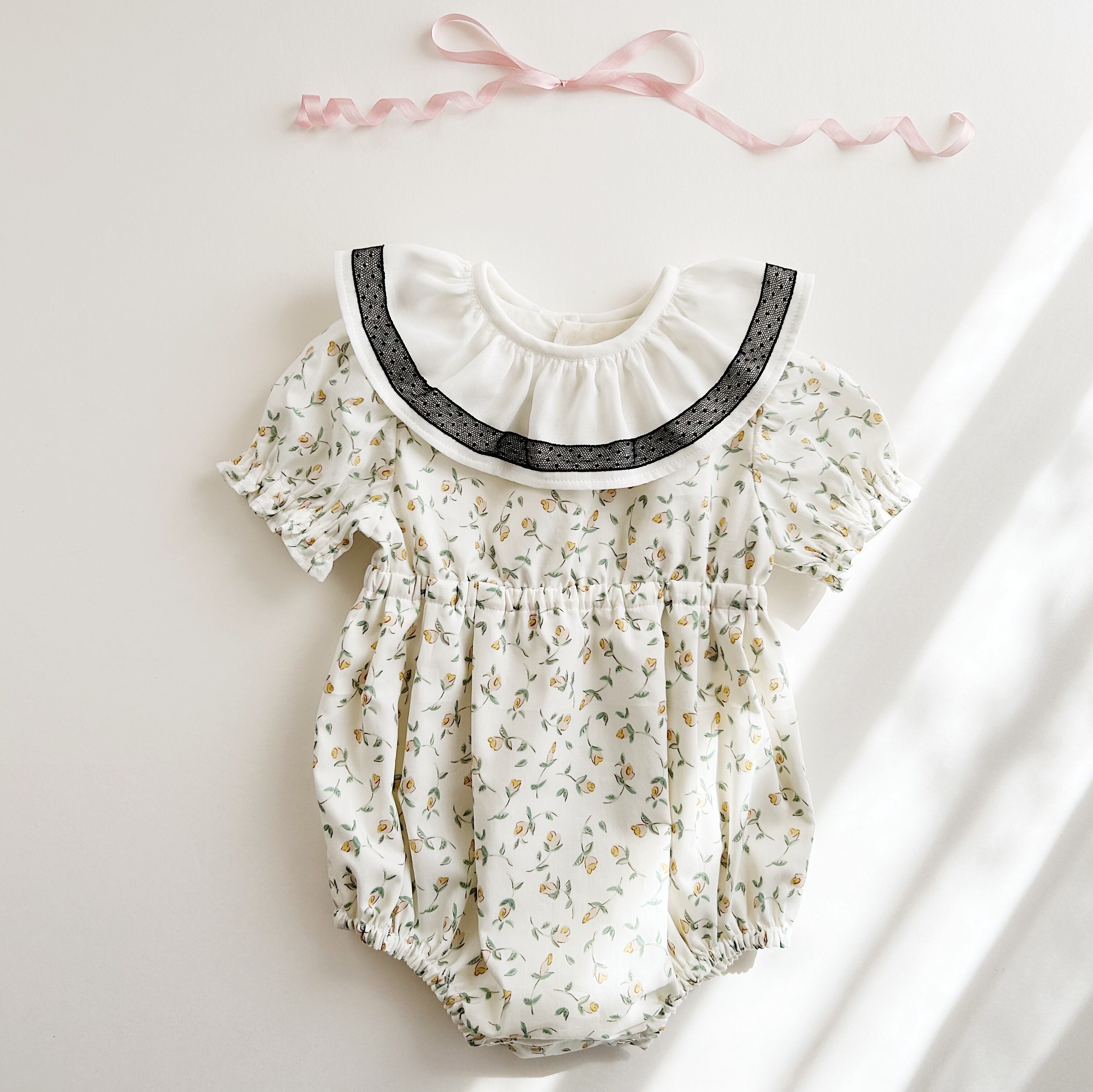フランス製の繊細なレースで、小さなお子さまのお顔をよりいっそう引き立ててくれるデザインです。