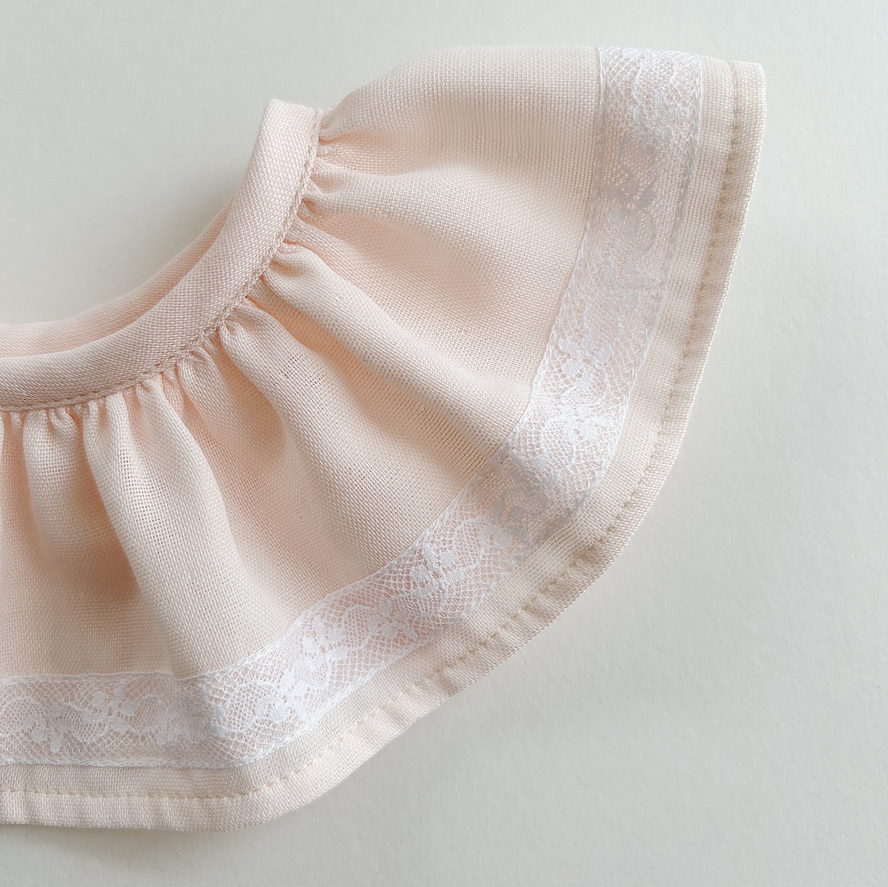 淡いサーモンピンクに真っ白のレースの淡いパステルトーンは、女の子の可愛さをより一層引き立ててくれます。