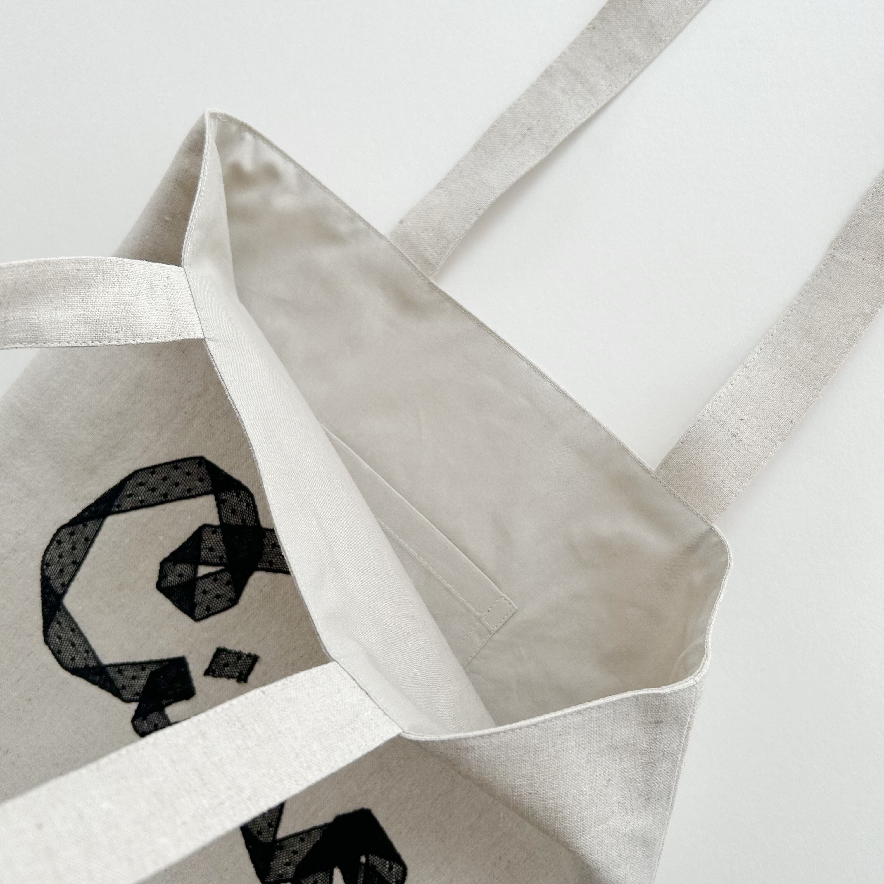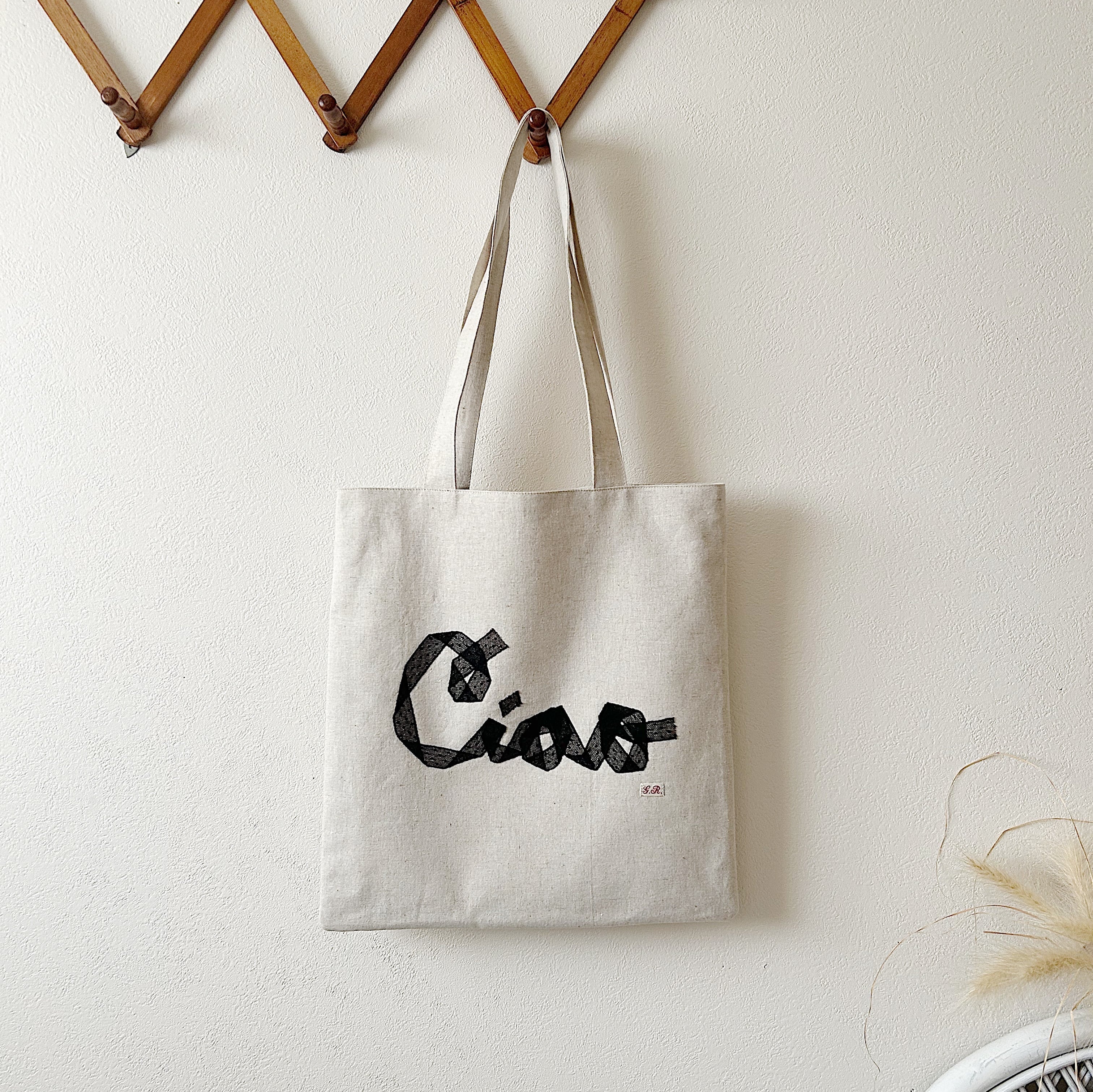 コットンリネンに Ciao のレース刺繍のトートバッグ