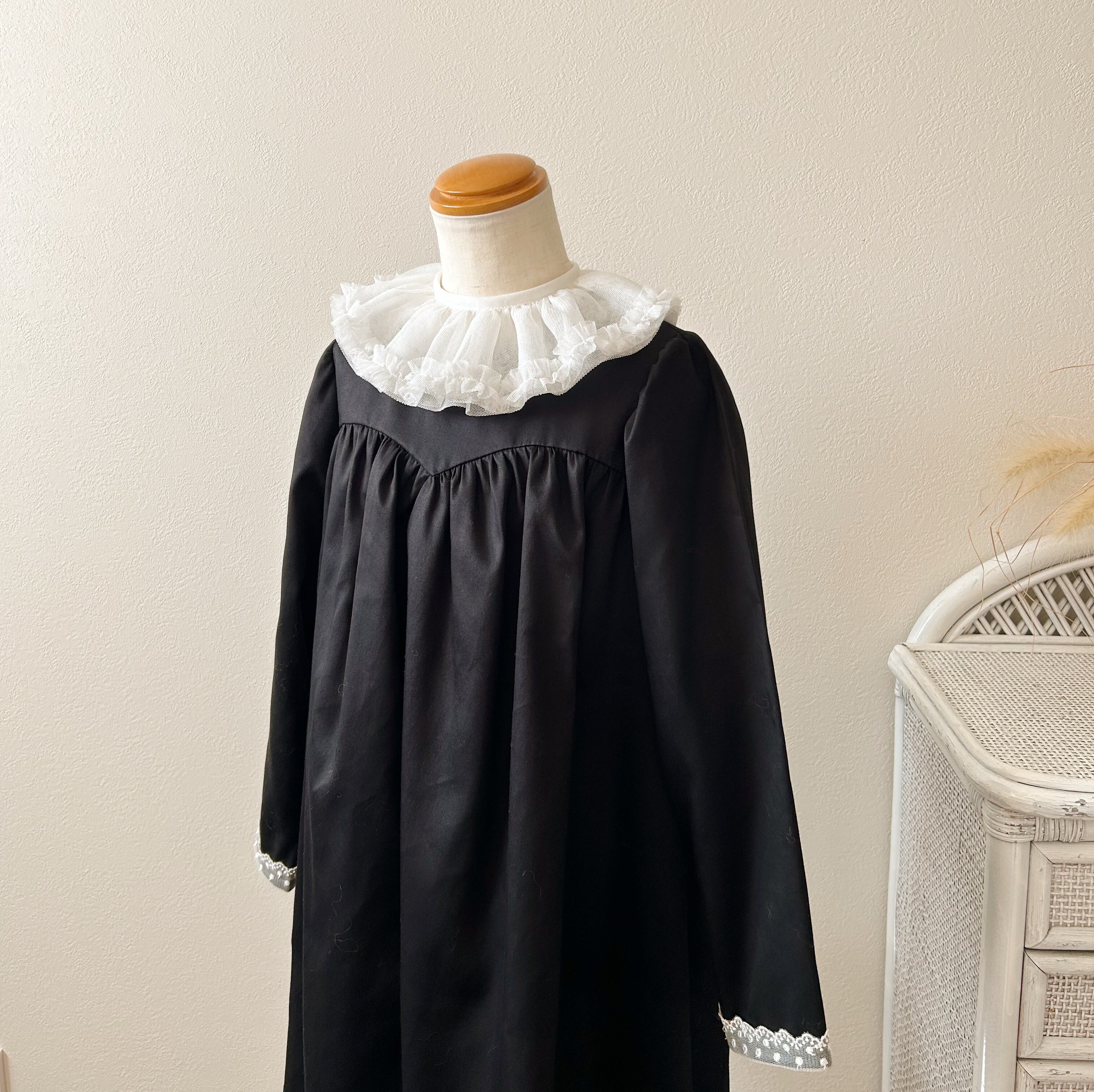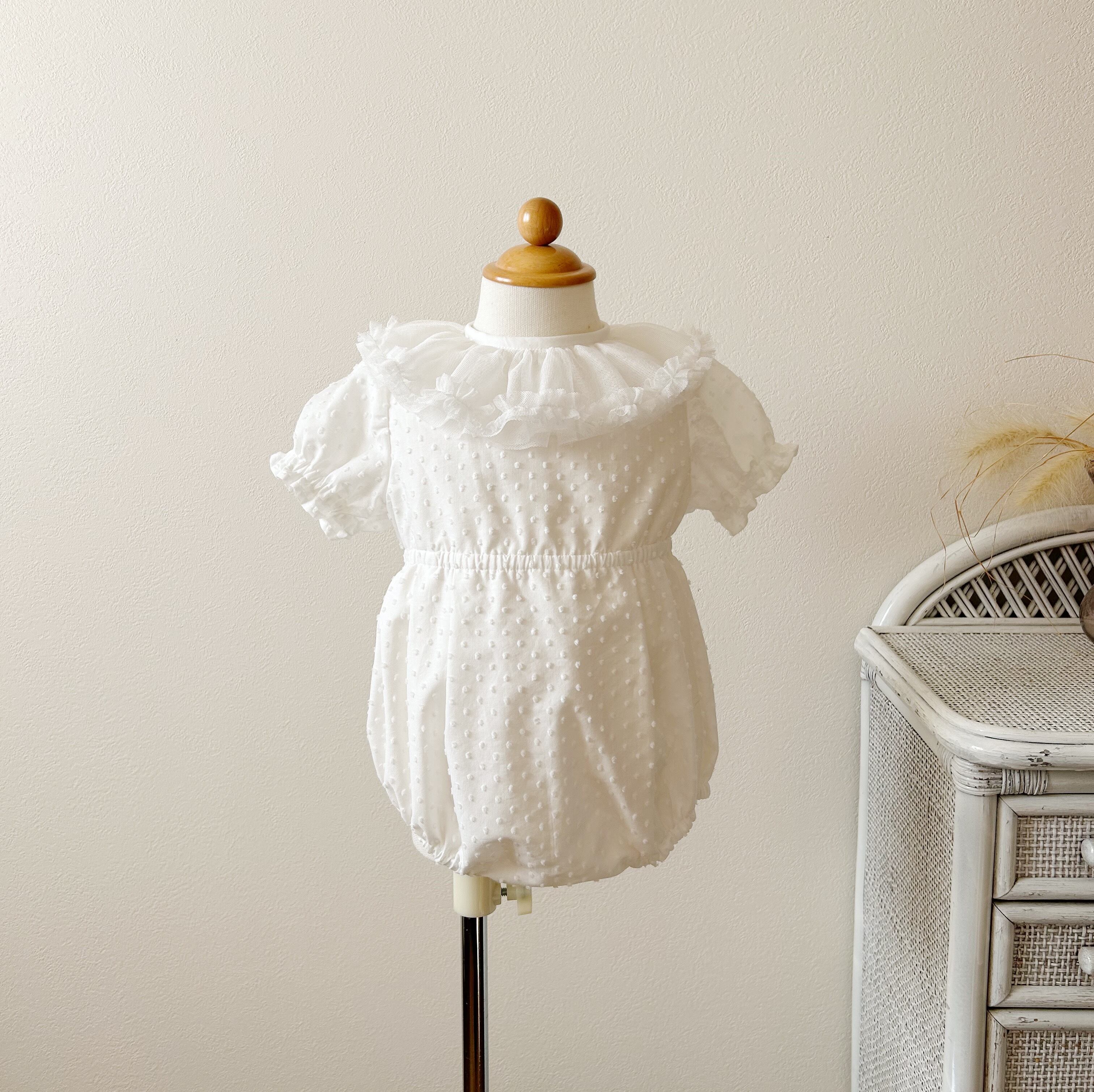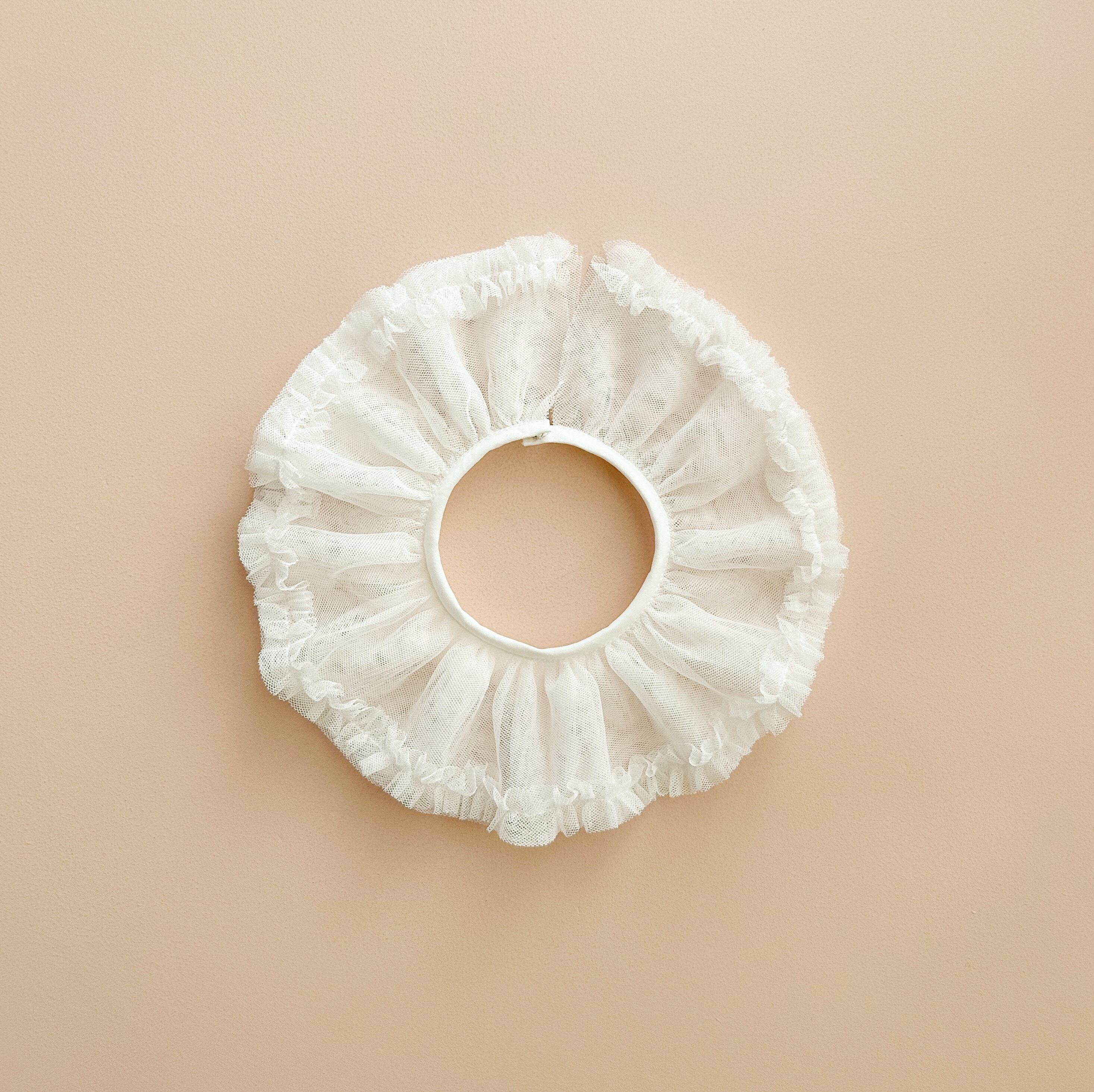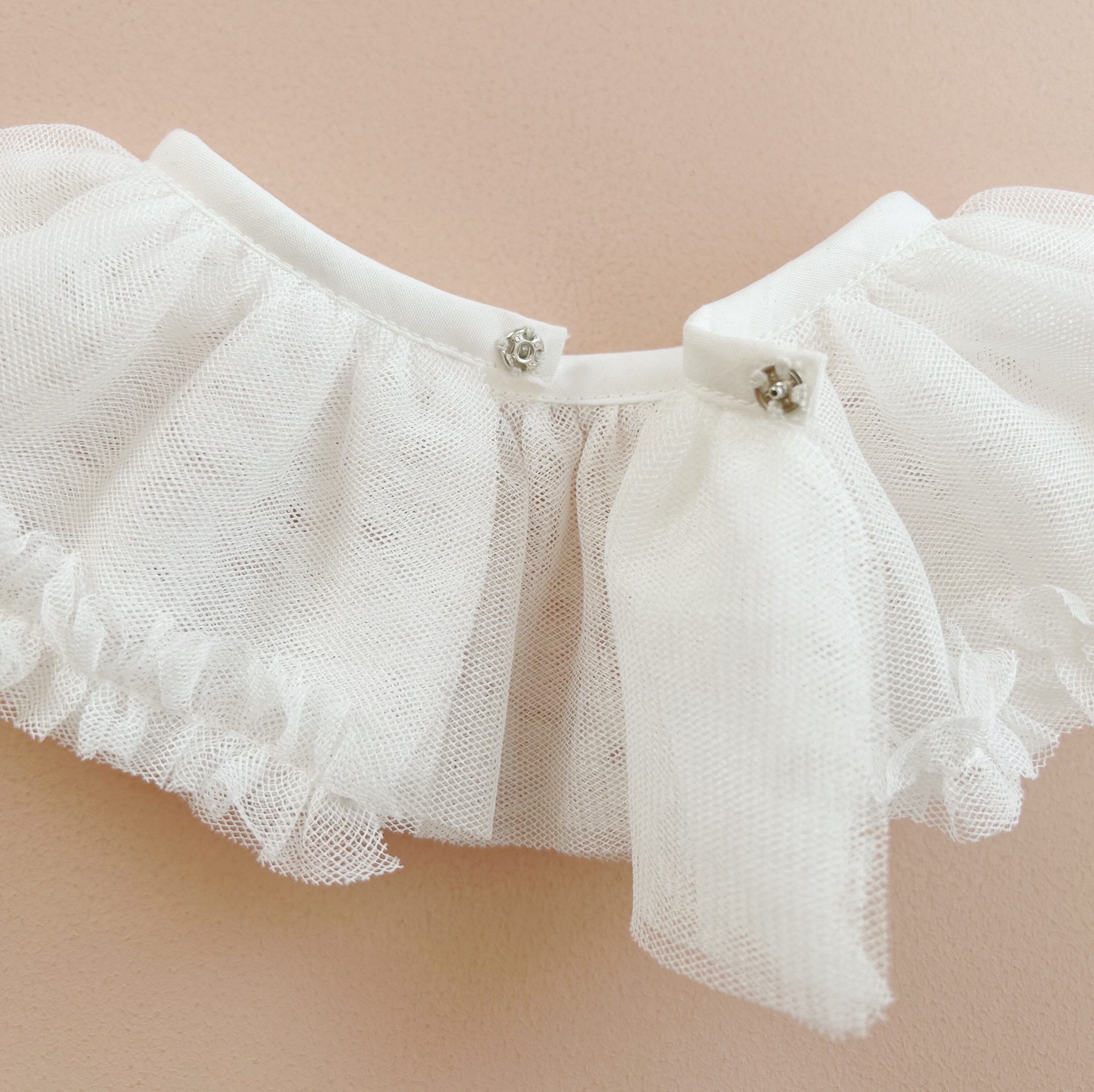 お子さまのお顔を可愛くふちどるふわふわのスフレをイメージした、軽やかなフリルのデザインです。