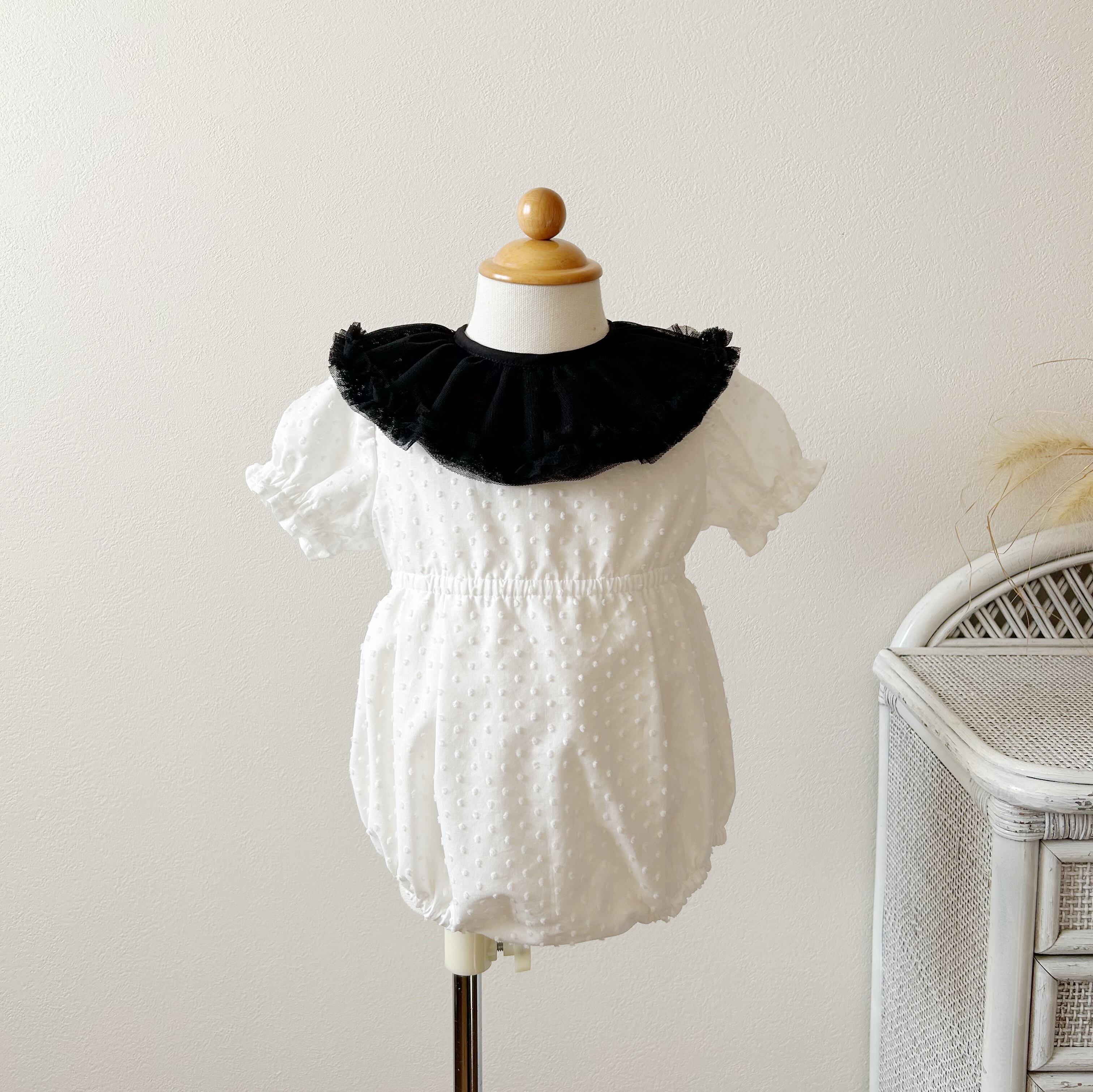 お子さまのお顔を可愛くふちどるふわふわのスフレをイメージした、軽やかなフリルのデザインです。