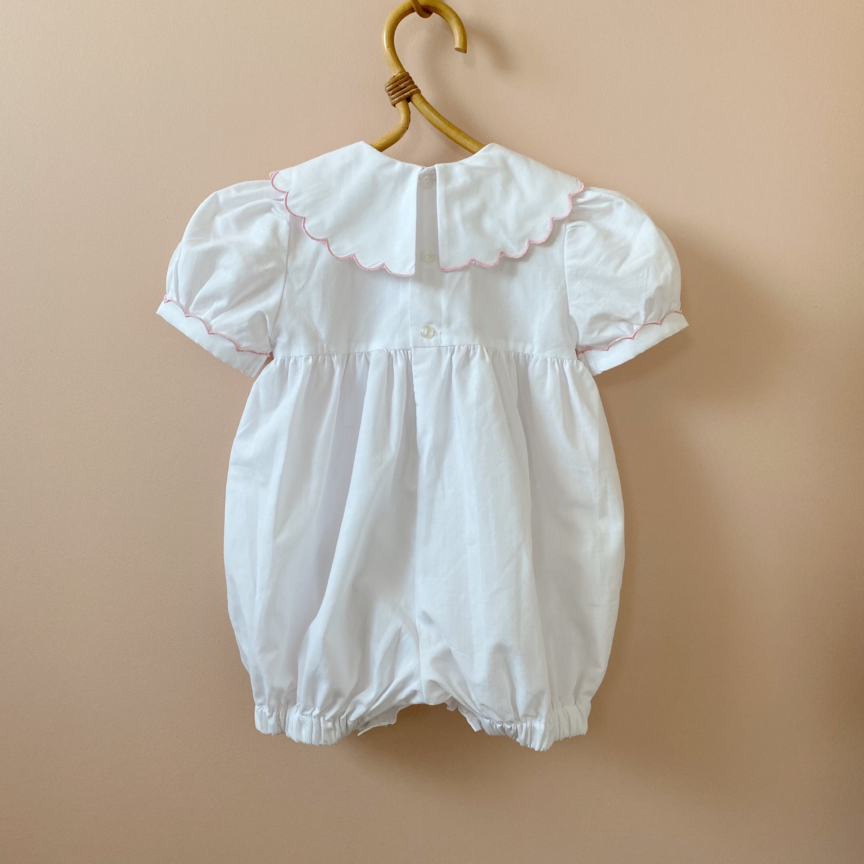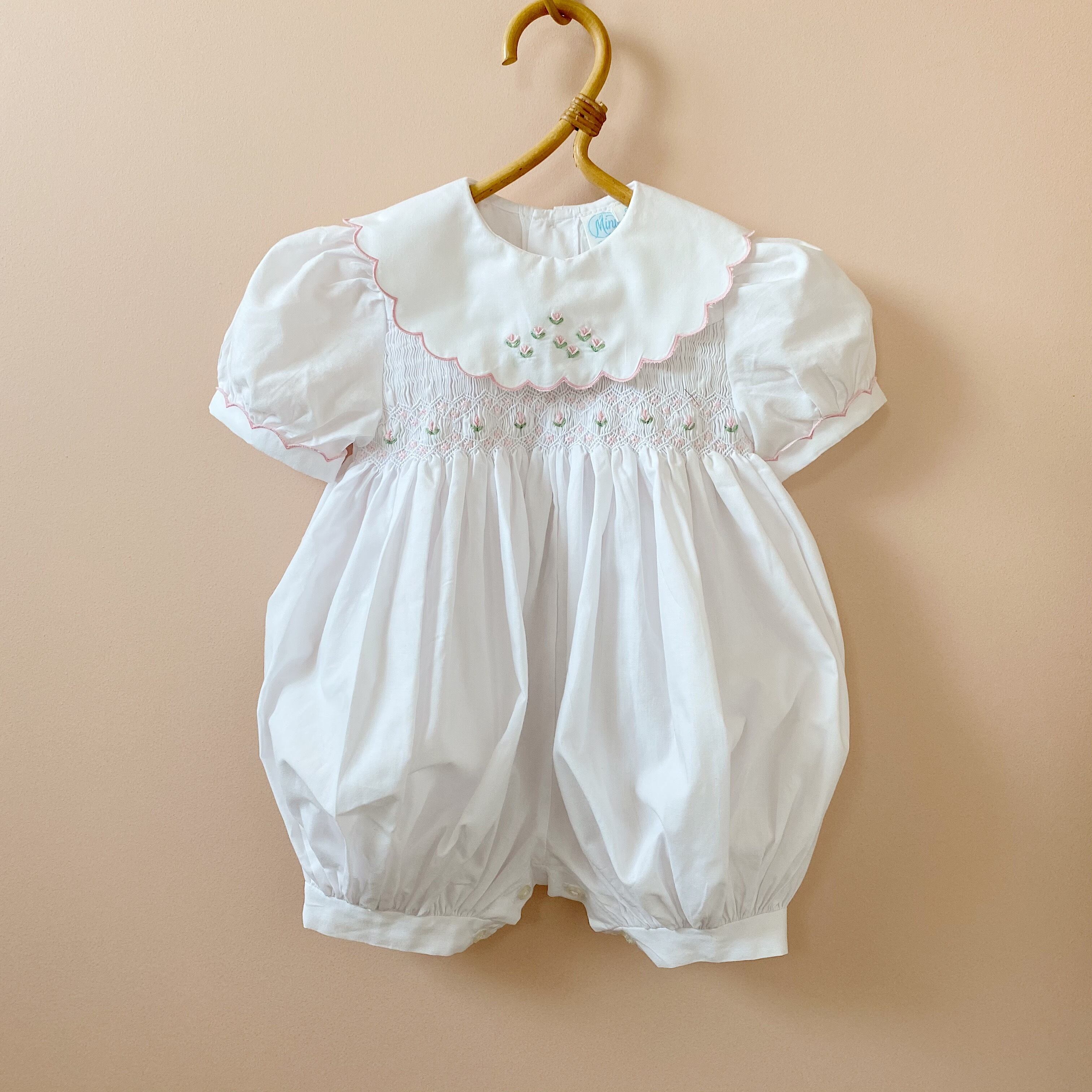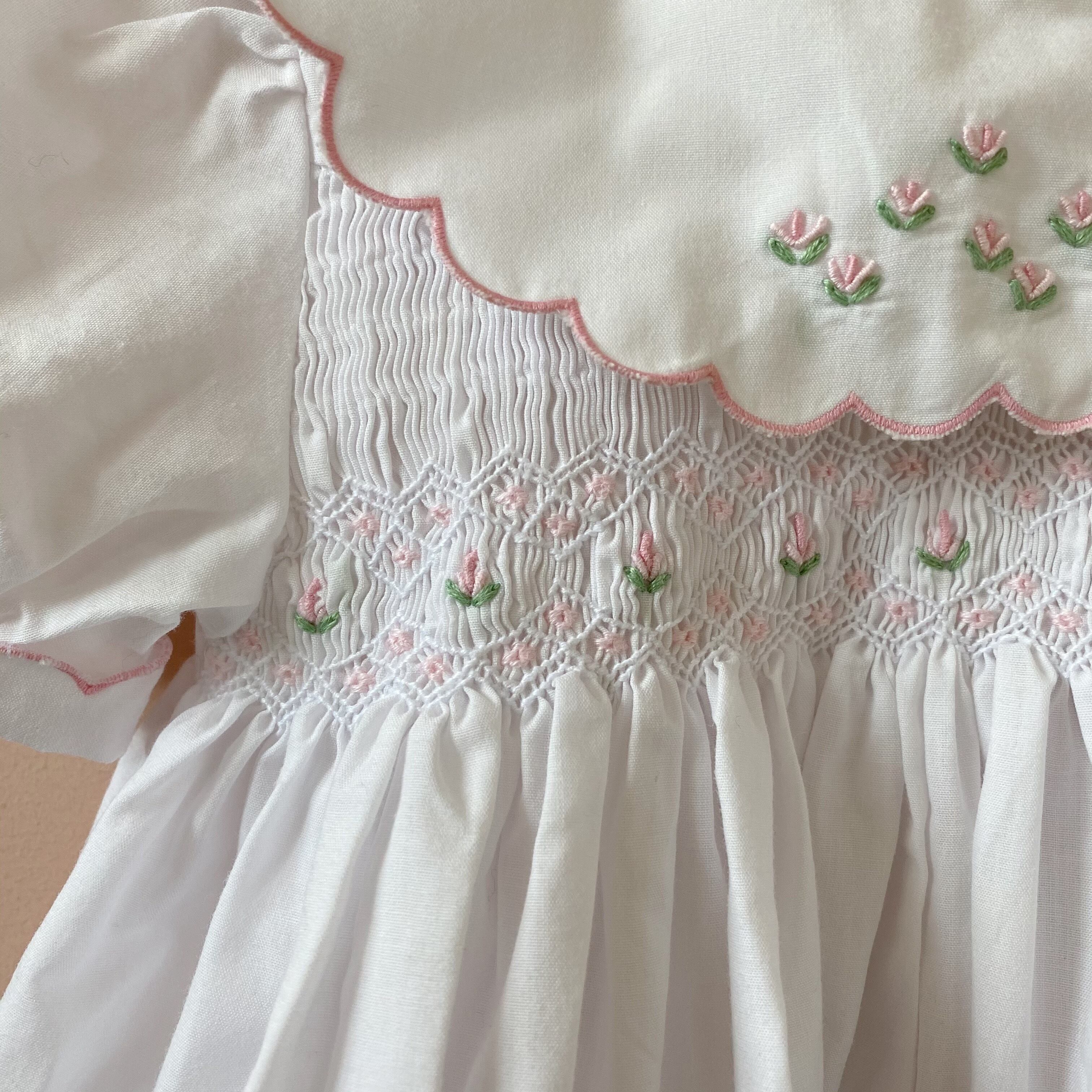 お花刺繍や胸部分のスモッキングも細かく、女の子の特別な日の一枚にぴったりです。