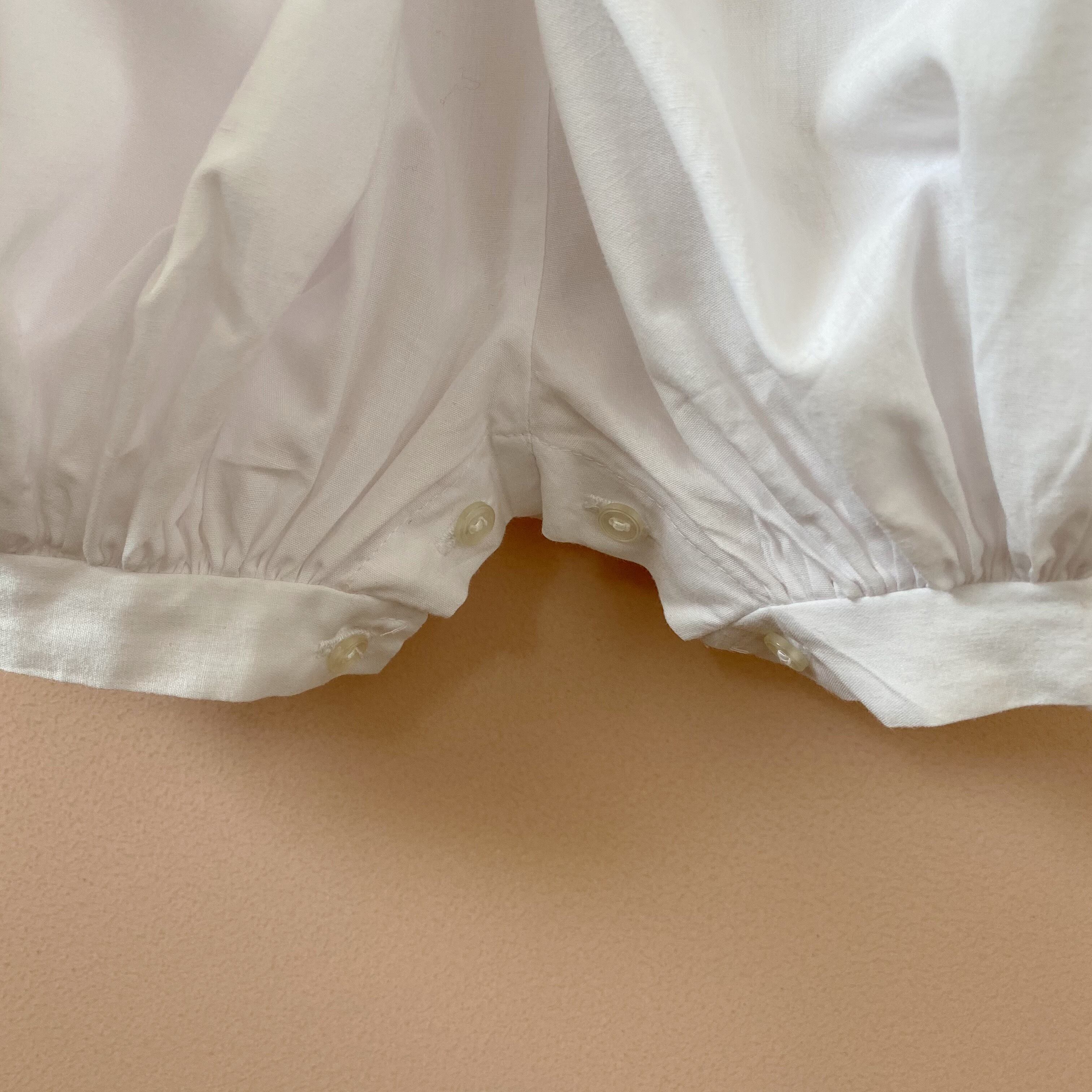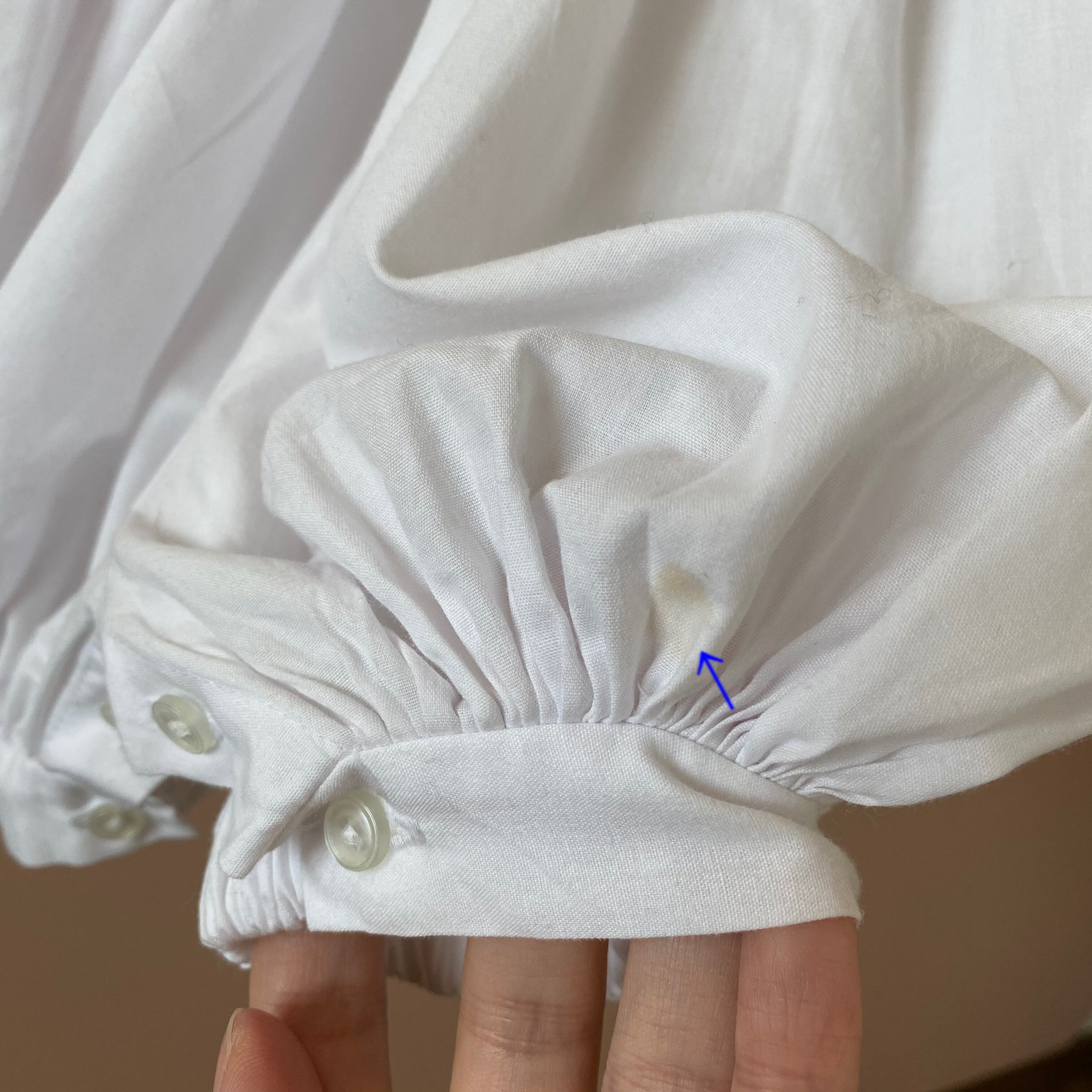 左足周りのギャザー部分にうっすらとしみ(画像7枚目)、襟と後ろボタンの近くに小さなしみ(画像8,9枚目)がありますが、いずれも目立つ部分ではなく、大きなダメージもなく比較的きれいな状態です。