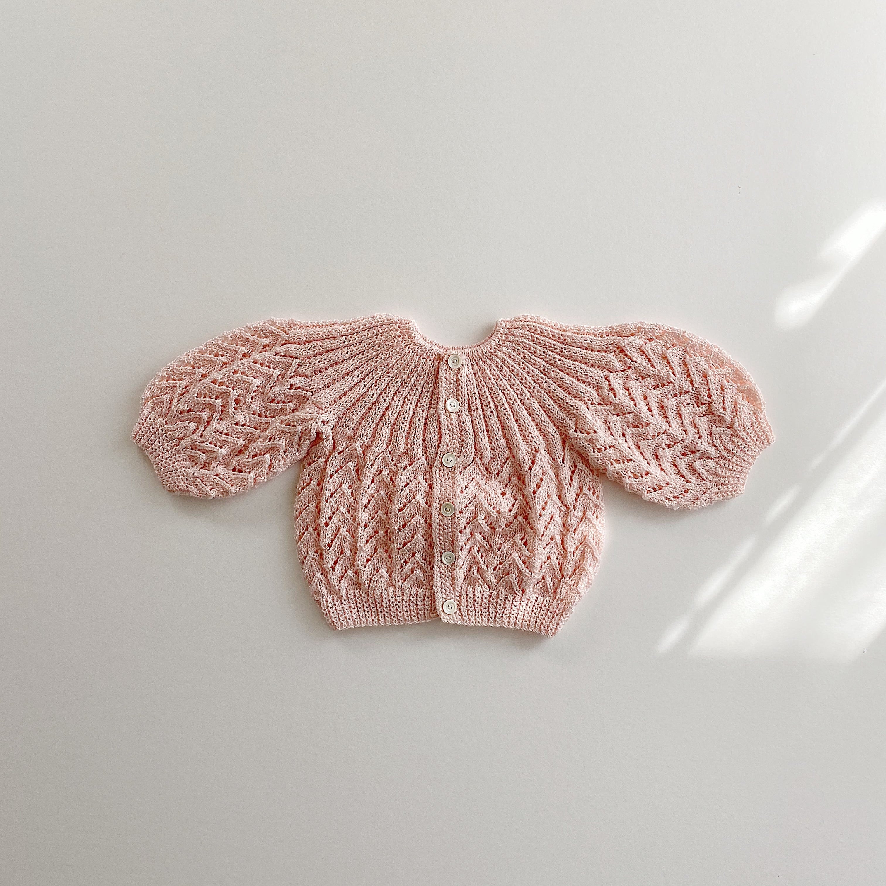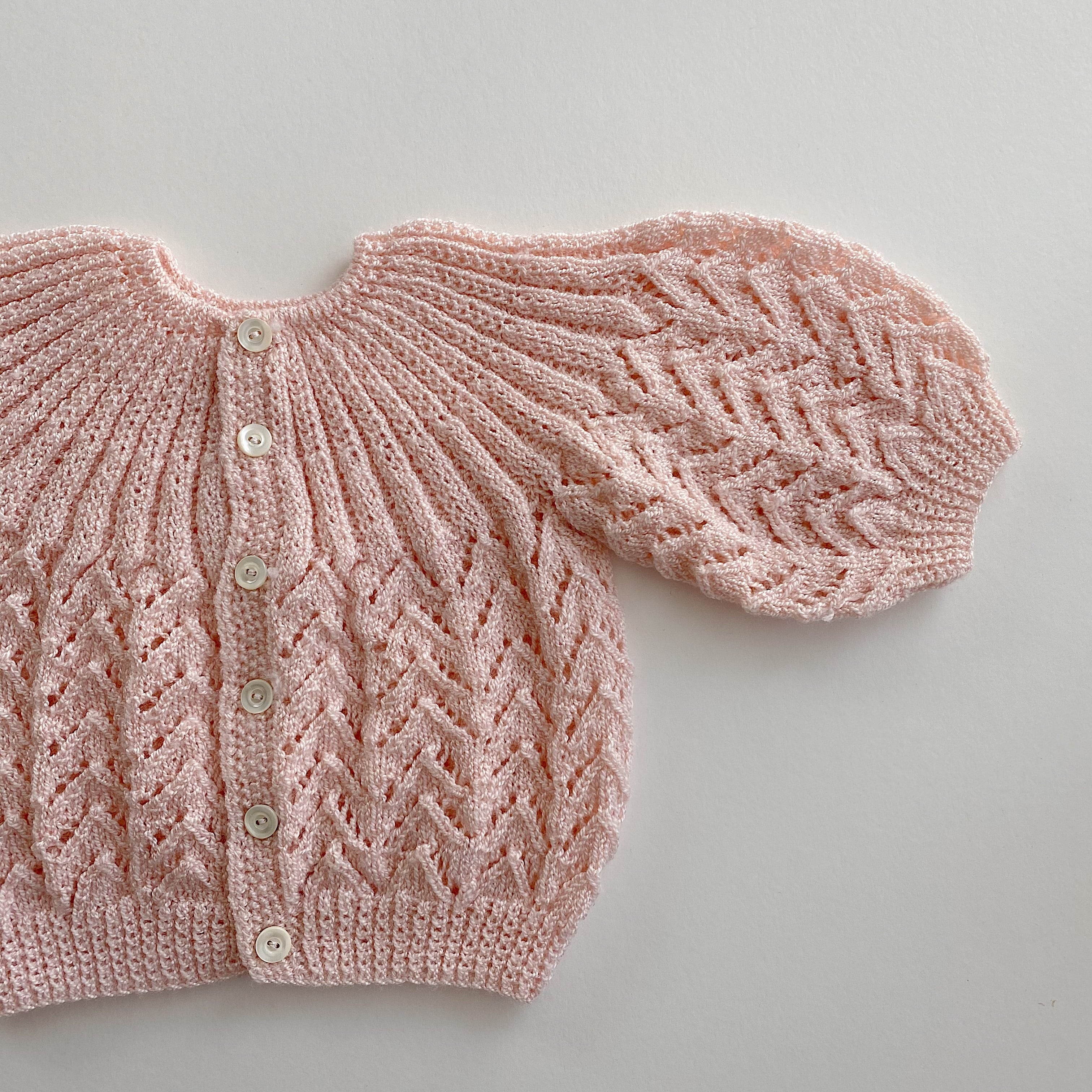 透かし編みの美しい、ちいさな手編みのカーディガン。