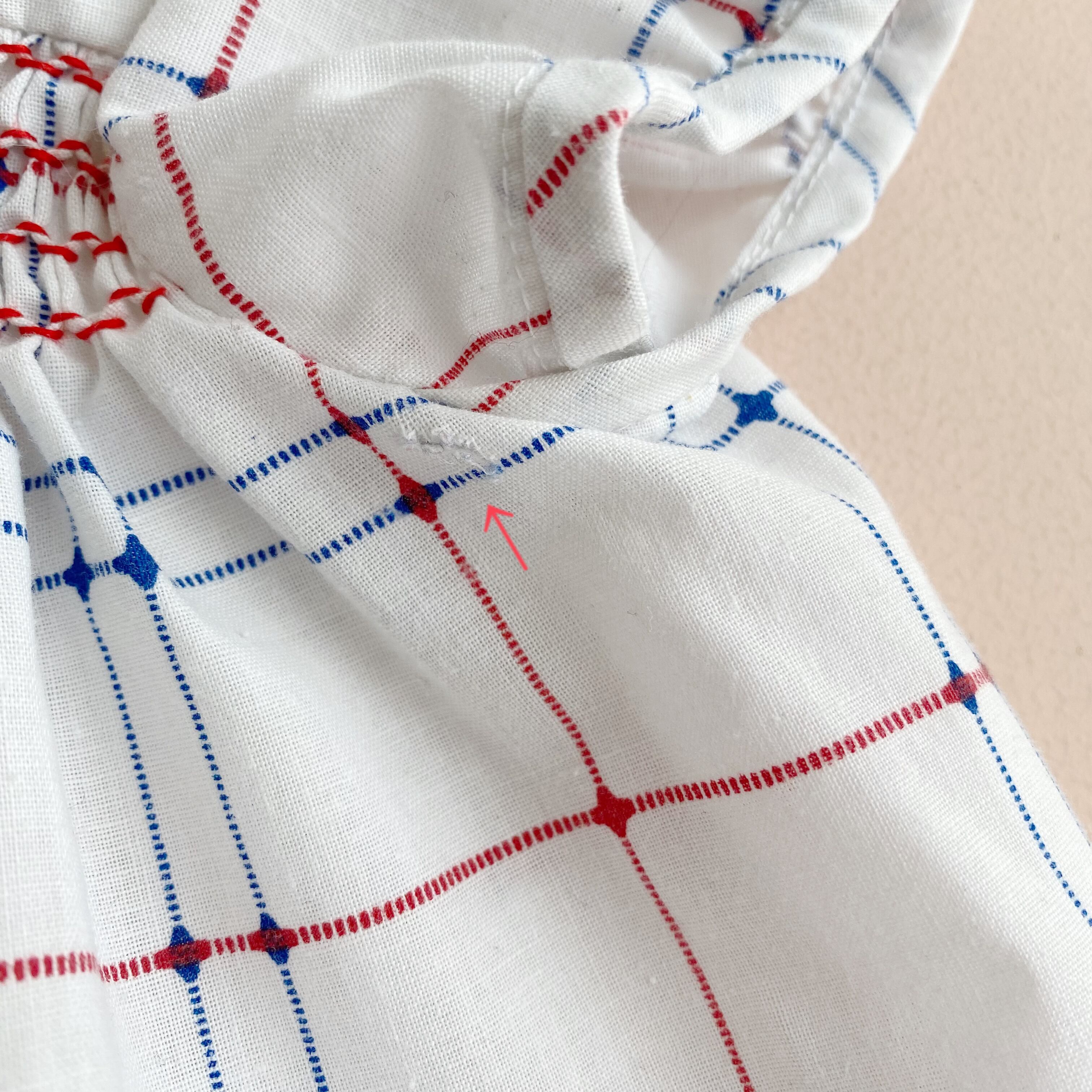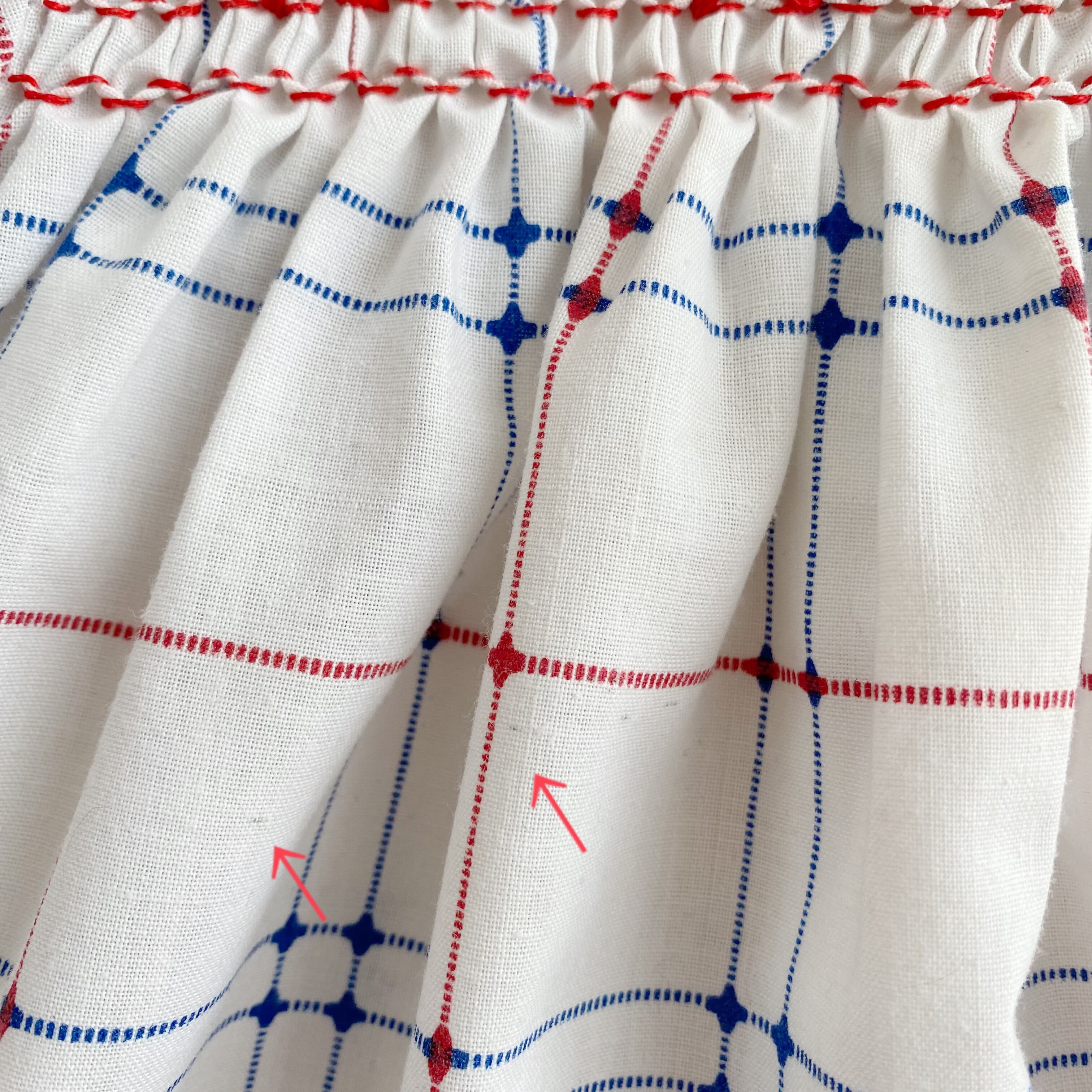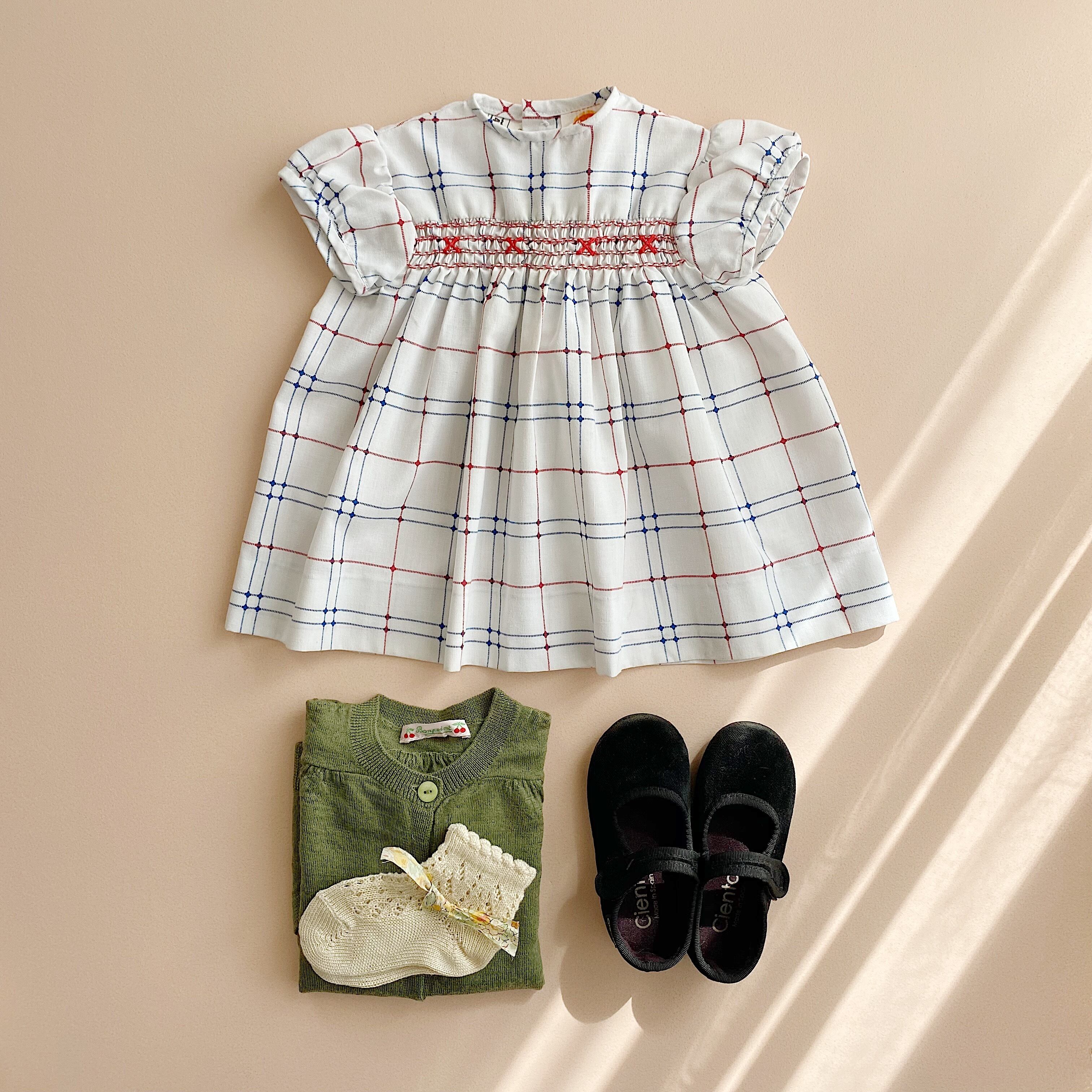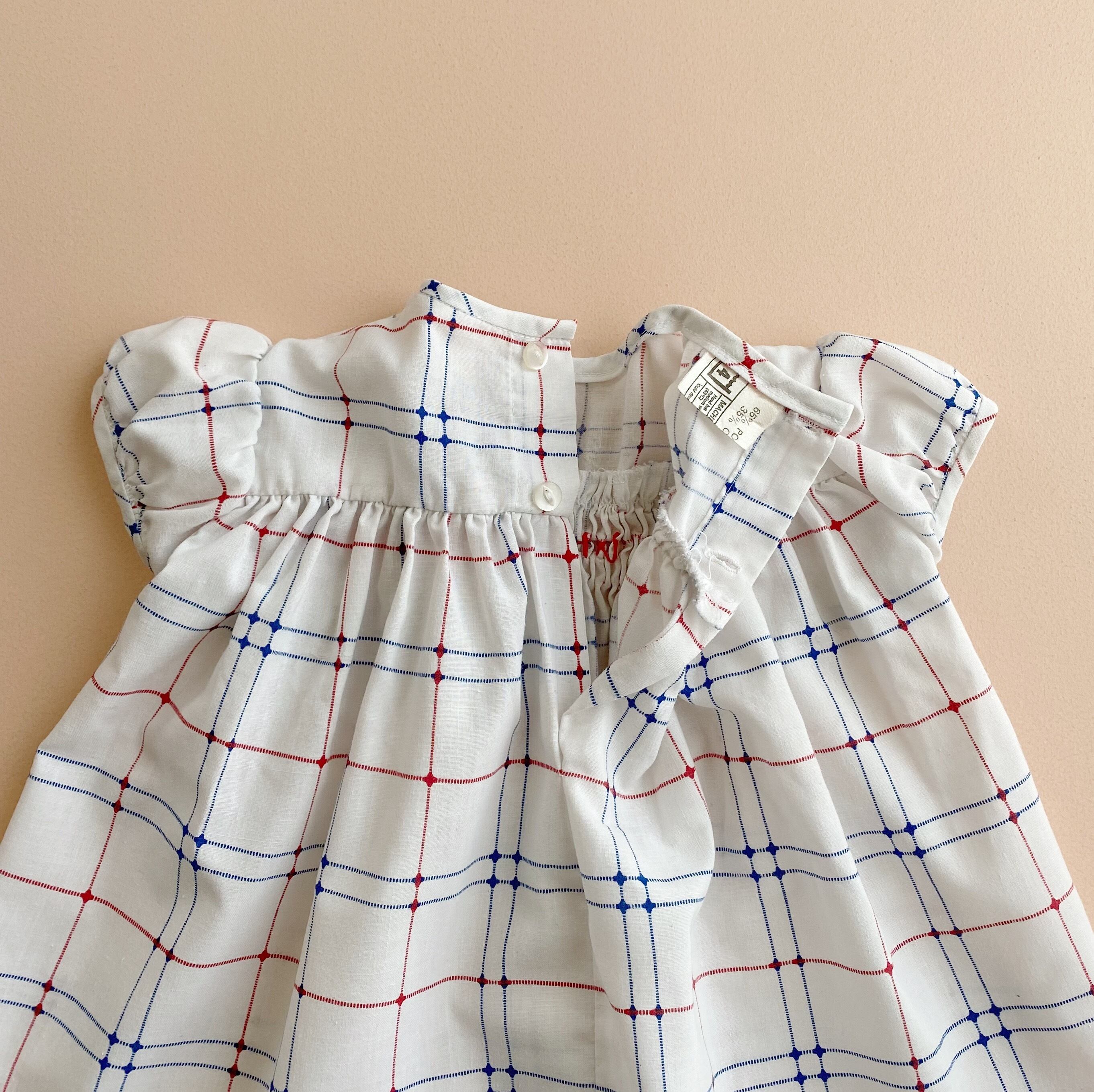 赤と青のチェック地に、手刺繍の赤いスモッキングが可愛らしいワンピース。