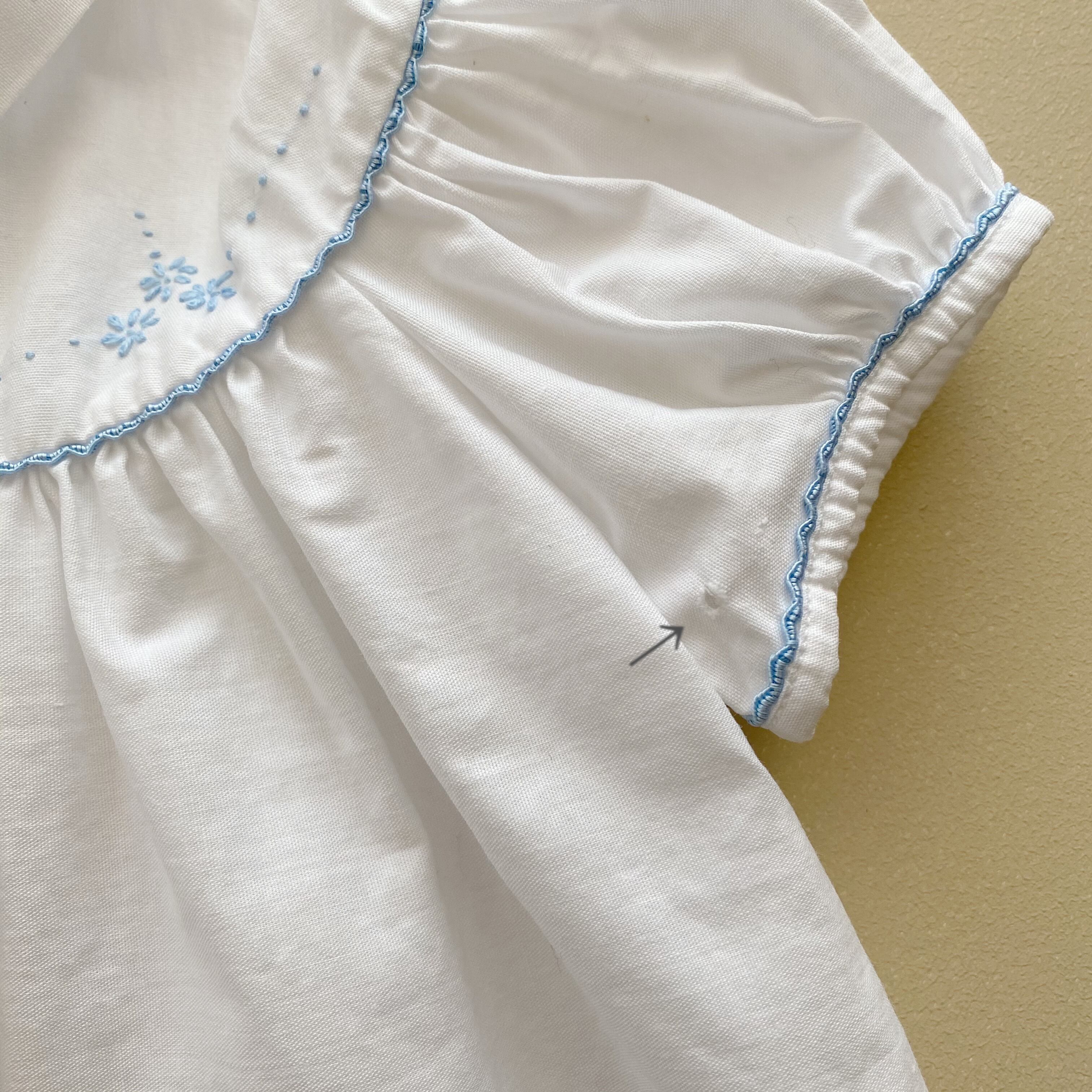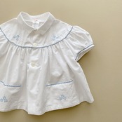水色のお花の手刺繍や、胸元と袖にはさまれた波型のブレードがとても可愛らしいです。