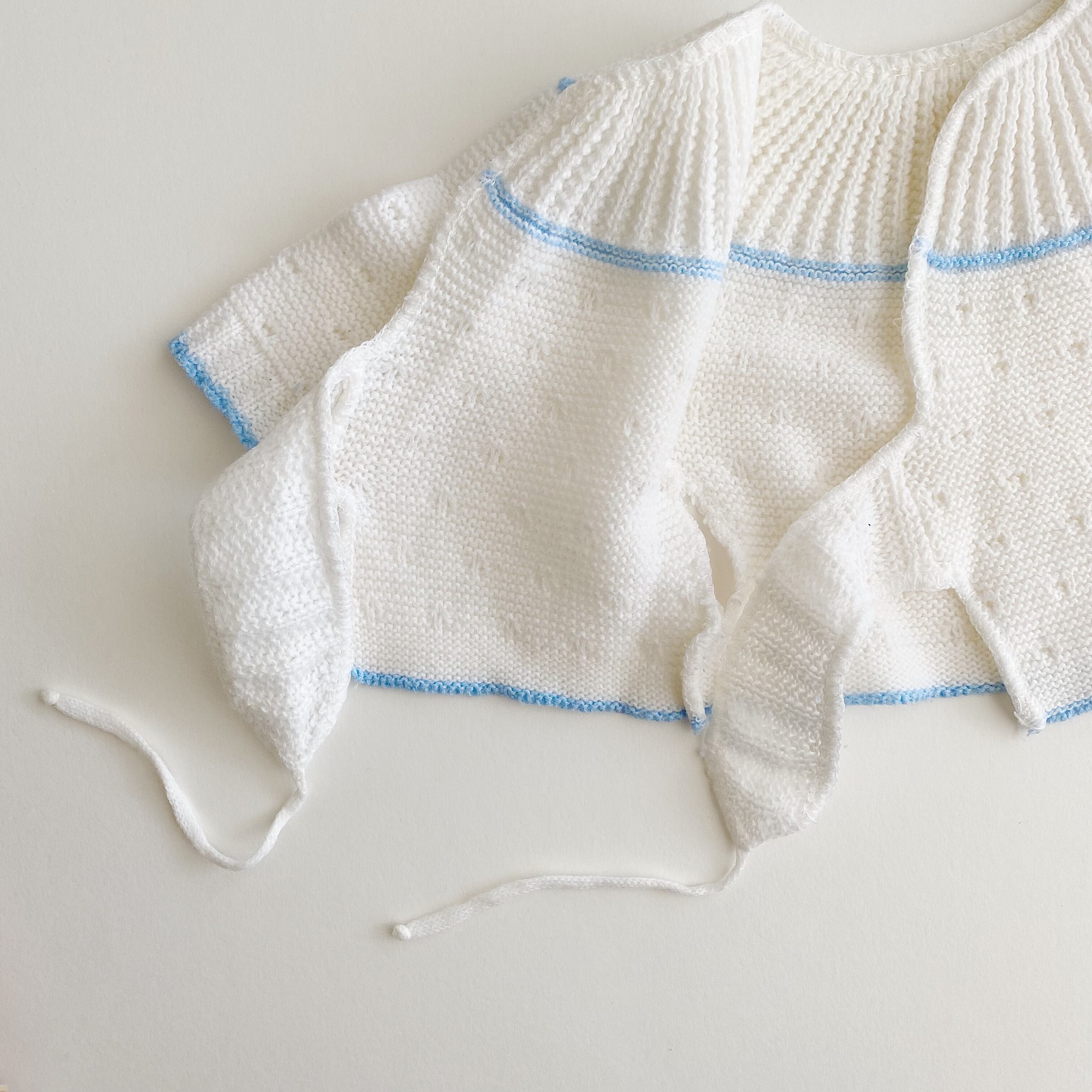 ラウンドヨークの編み模様や、袖と胴の水玉模様もとても愛らしいです。