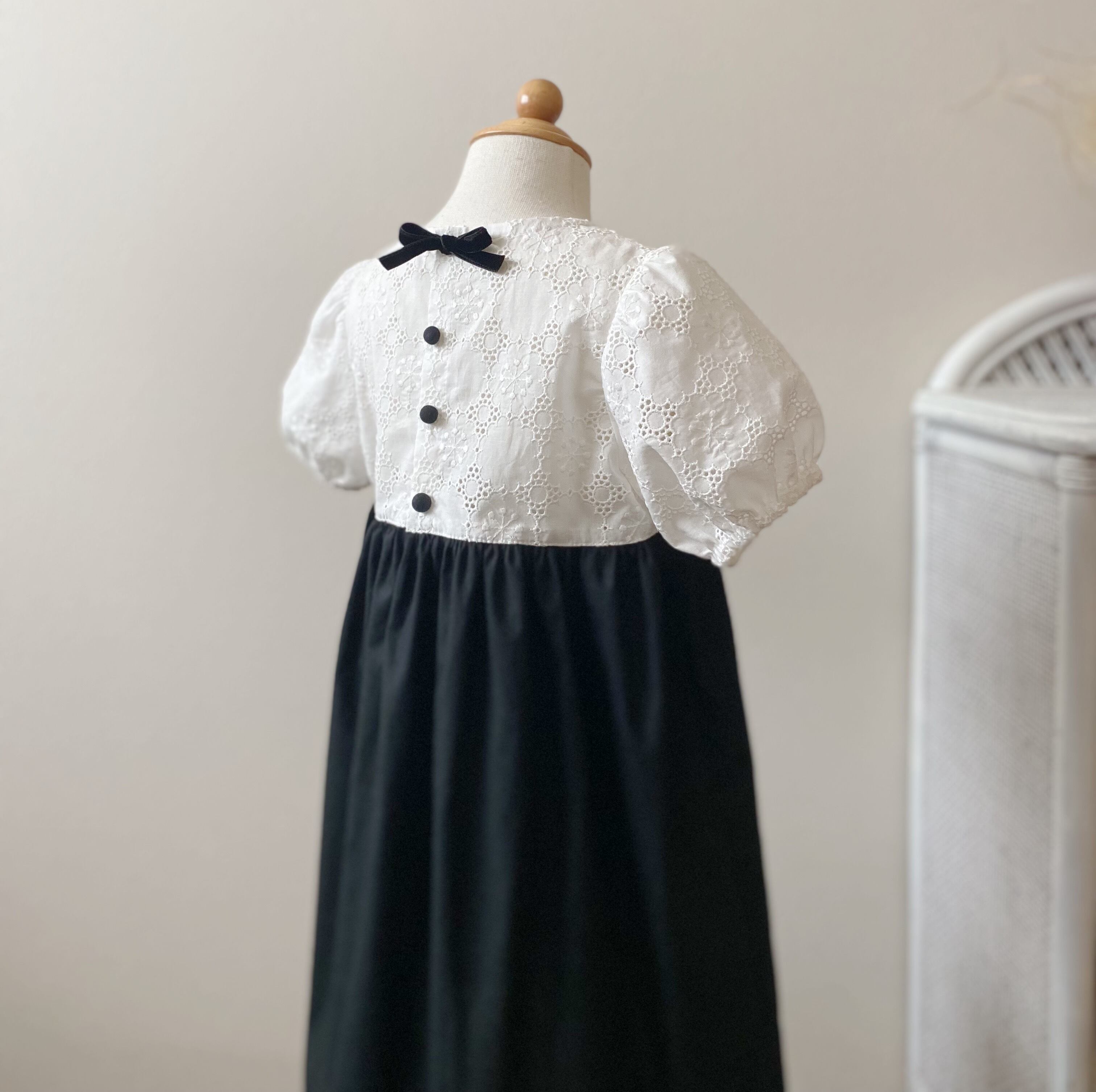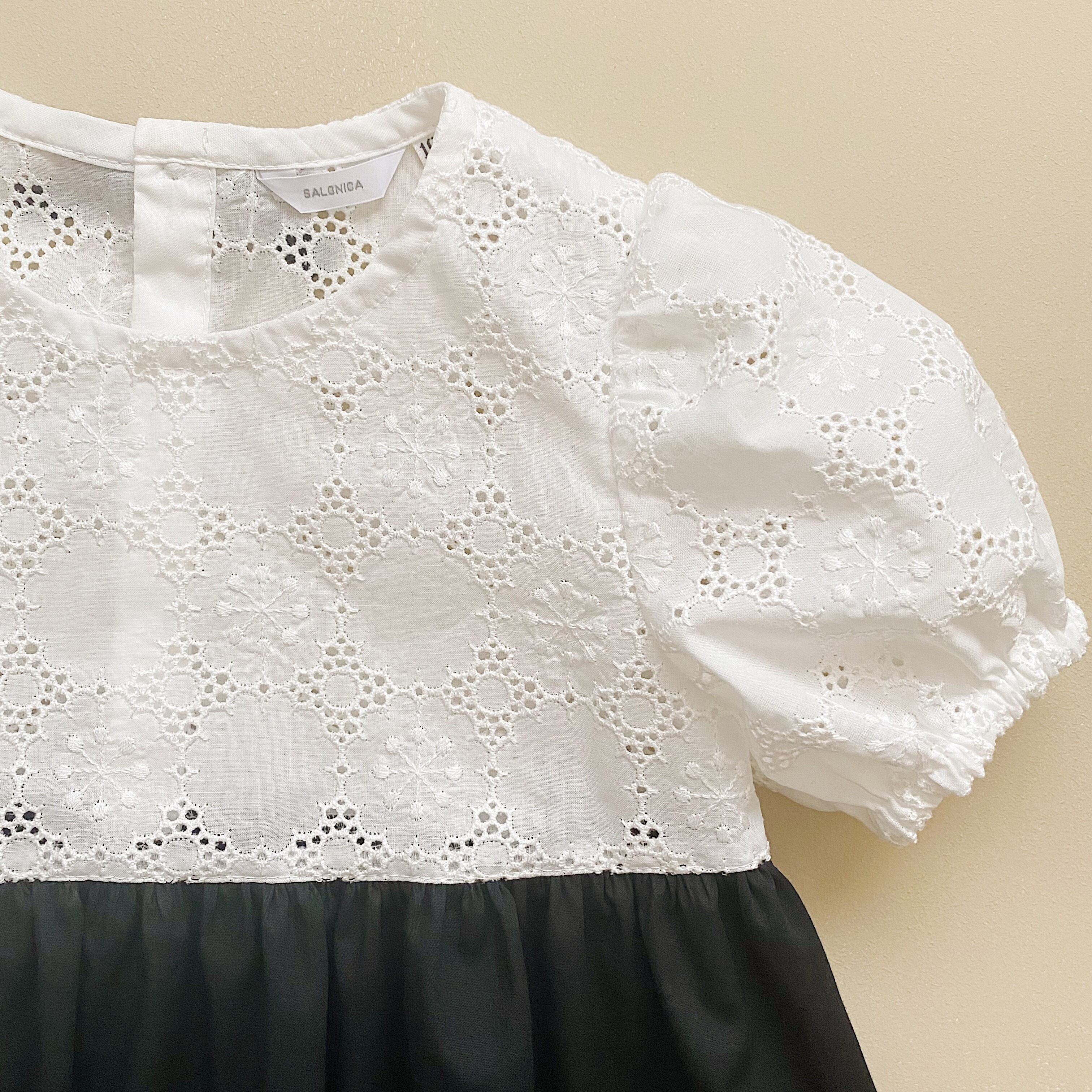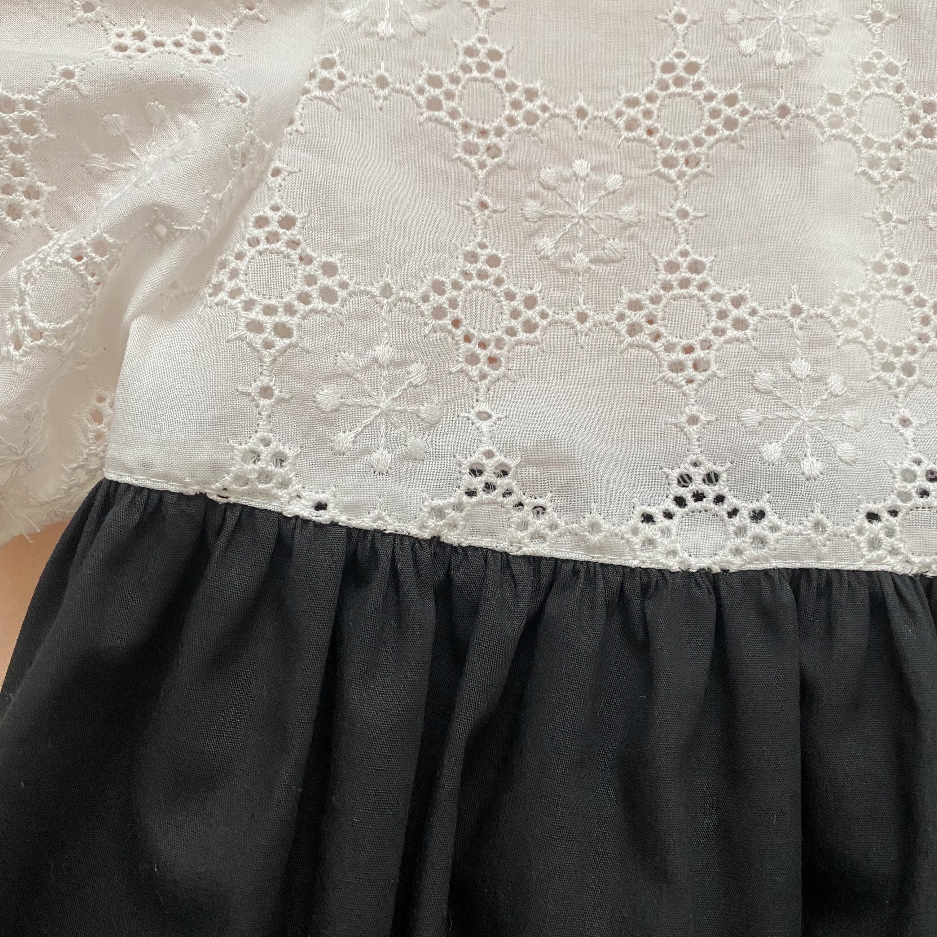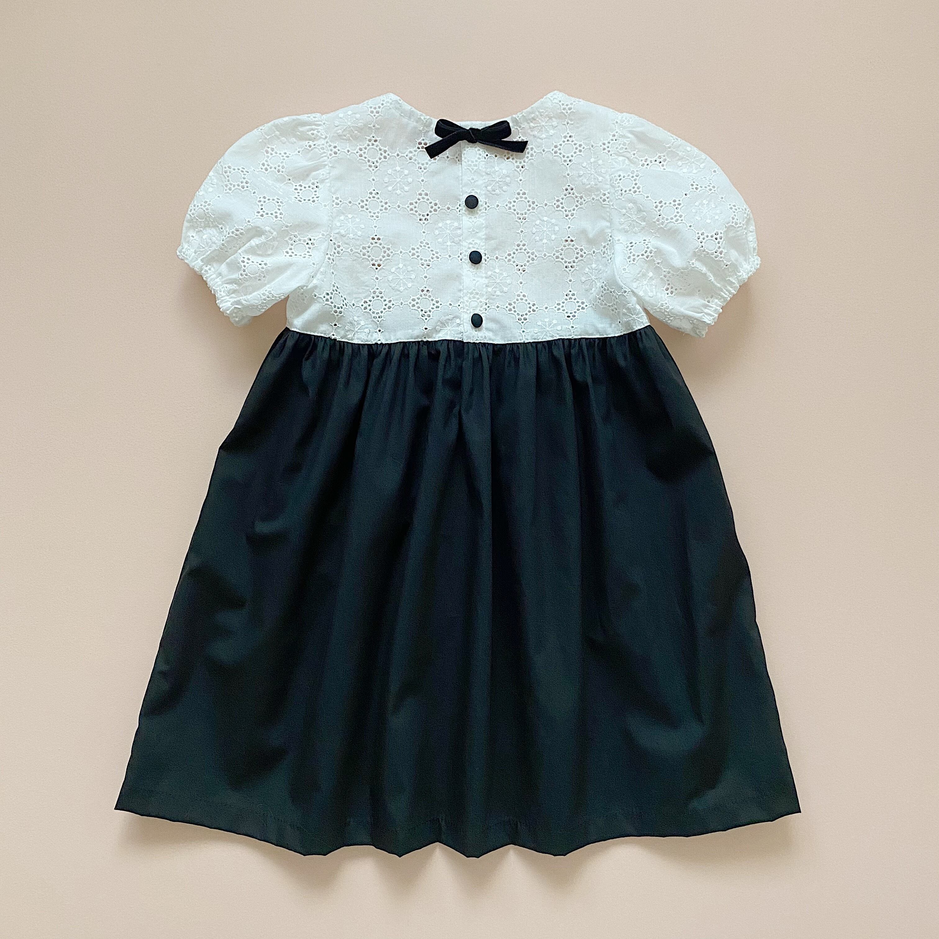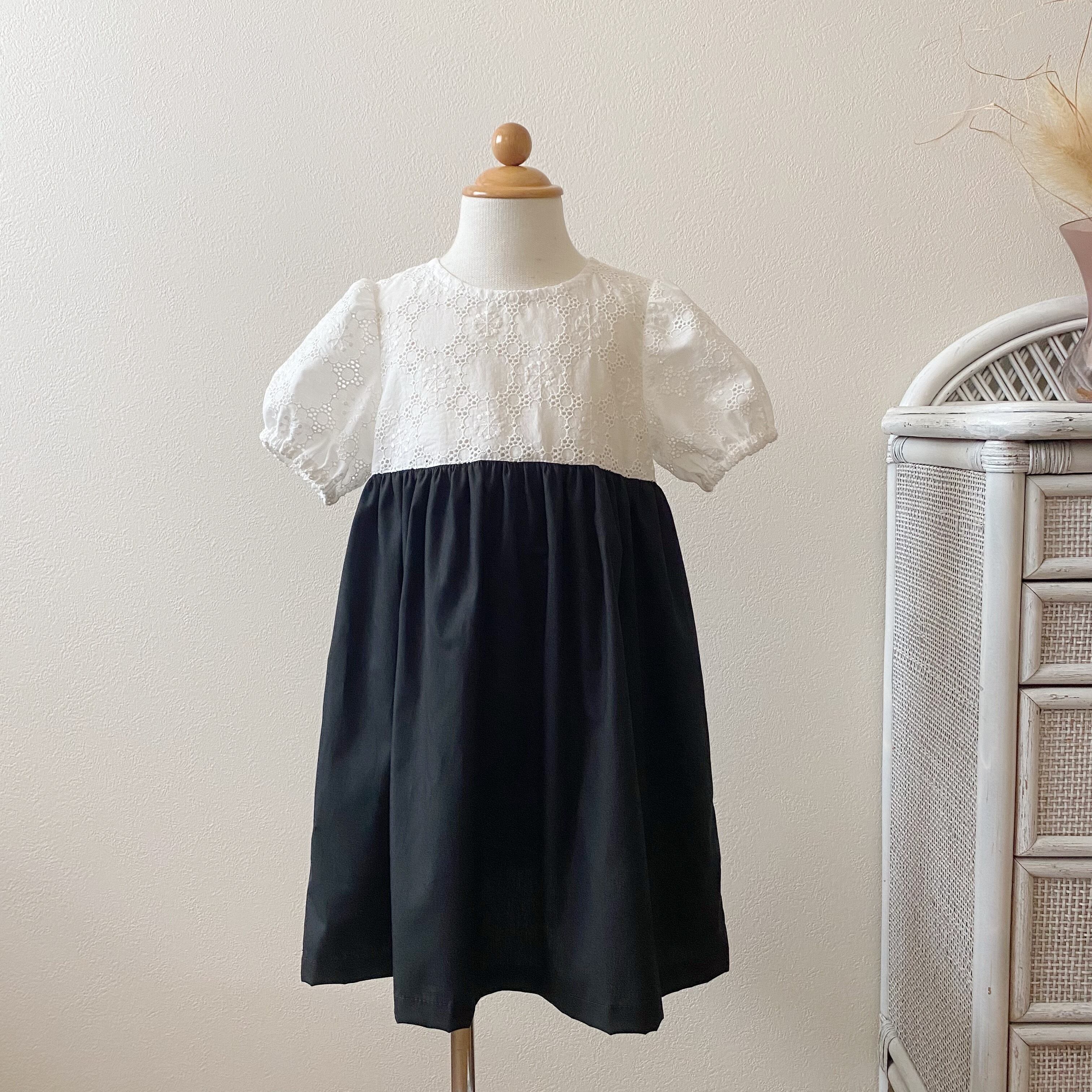 白いお花モチーフのレースと黒いコットンのドッキングワンピース。