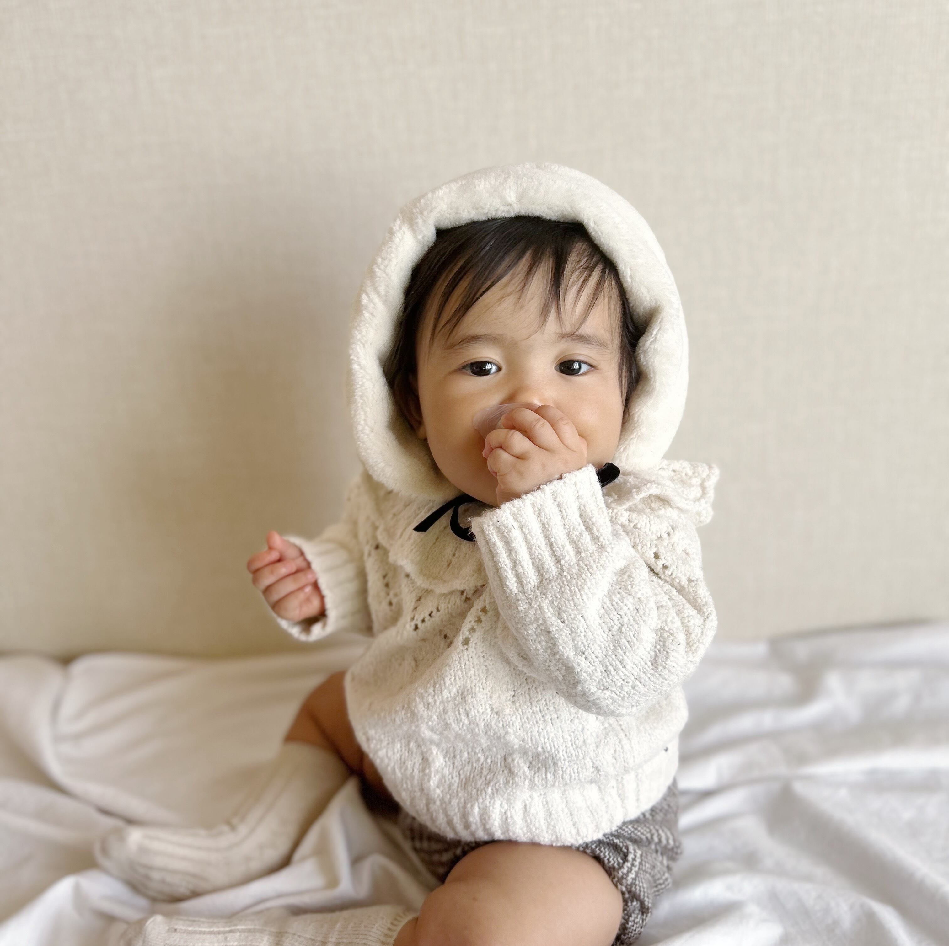 ヨーロッパのアンティーク・ボンネットをイメージし、今の子供服スタイルにも合わせやすいシンプルな形にデザインしました。