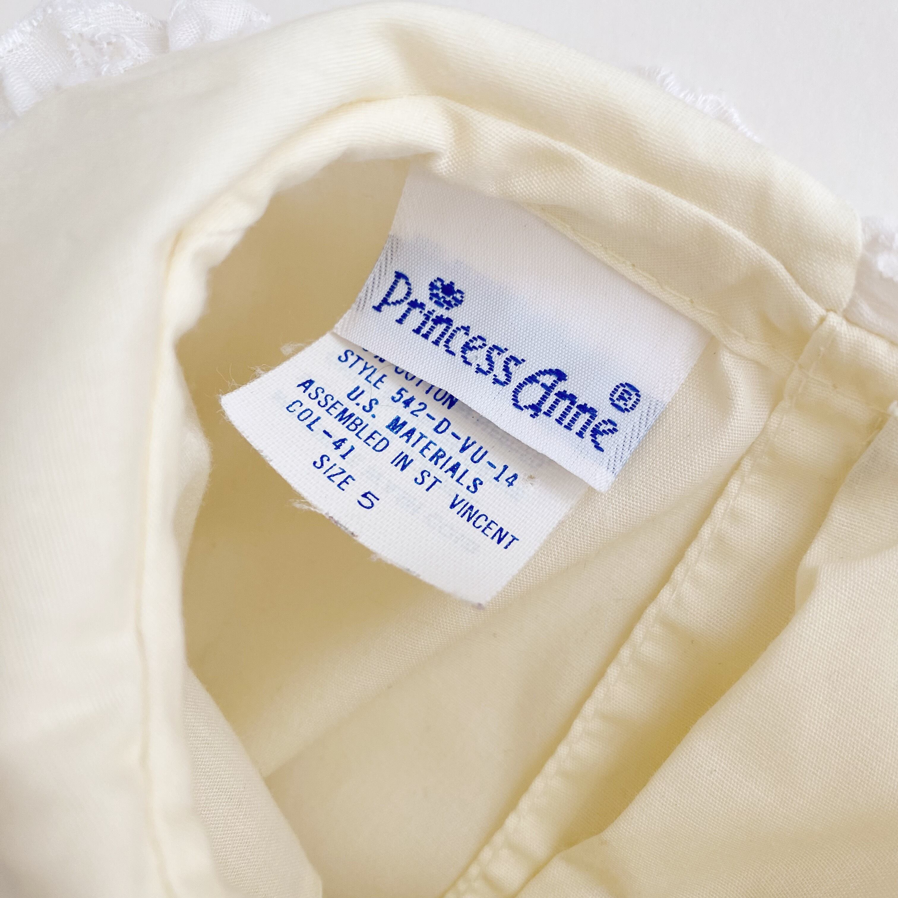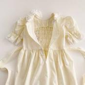 淡いクリームイエローの生地に、襟と袖に白いレースの縁取り