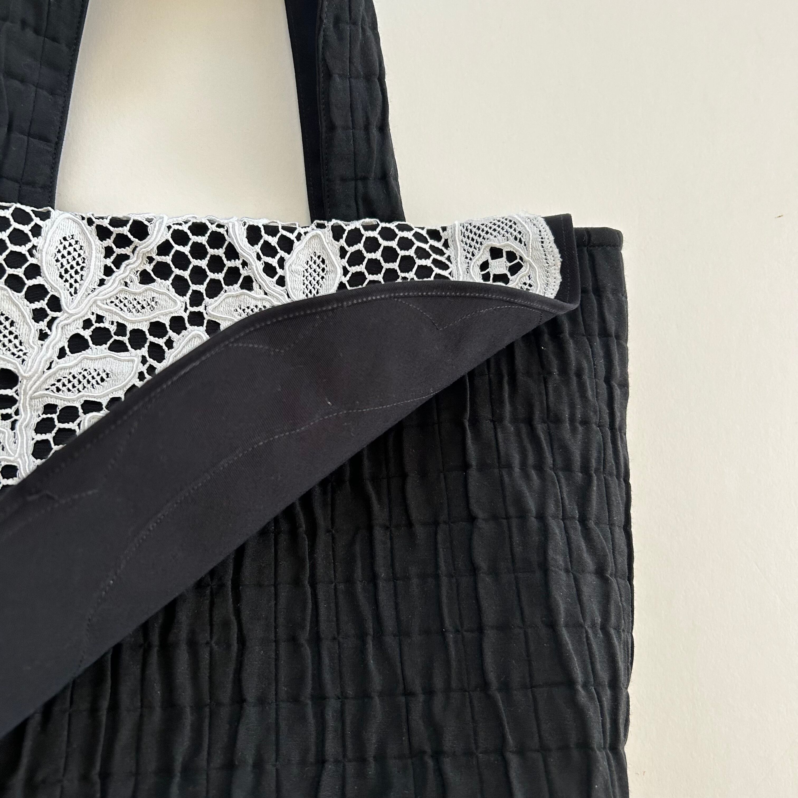 レースにダメージが見られますので、黒いコットングログラン生地に縫い付け、ダメージができるだけ広がりにくいようにお作りしました。