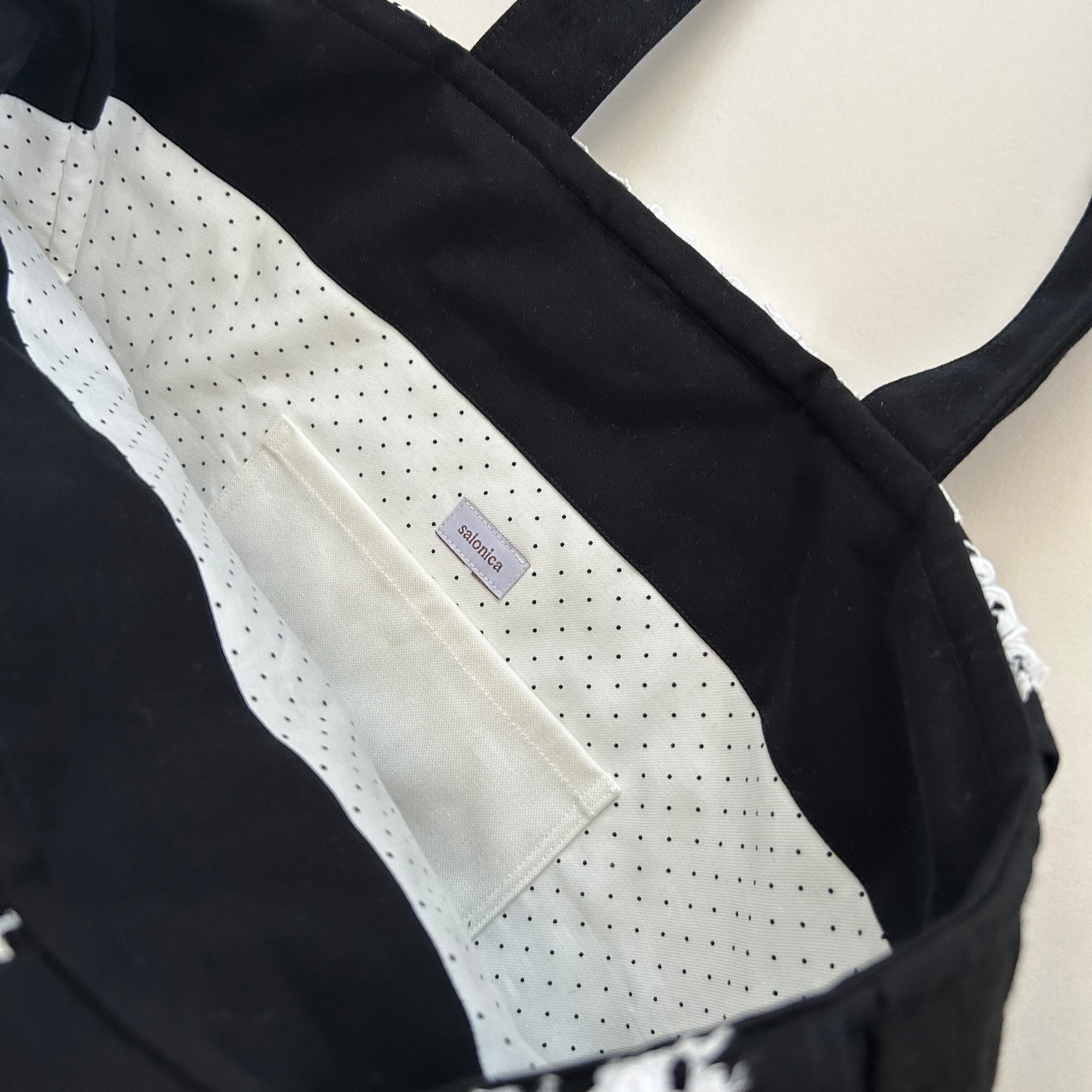 裏地には小さなドット模様のコットンを使い、何かとかさばる持ち物を探しやすく、開けるのが楽しくなるバッグに。